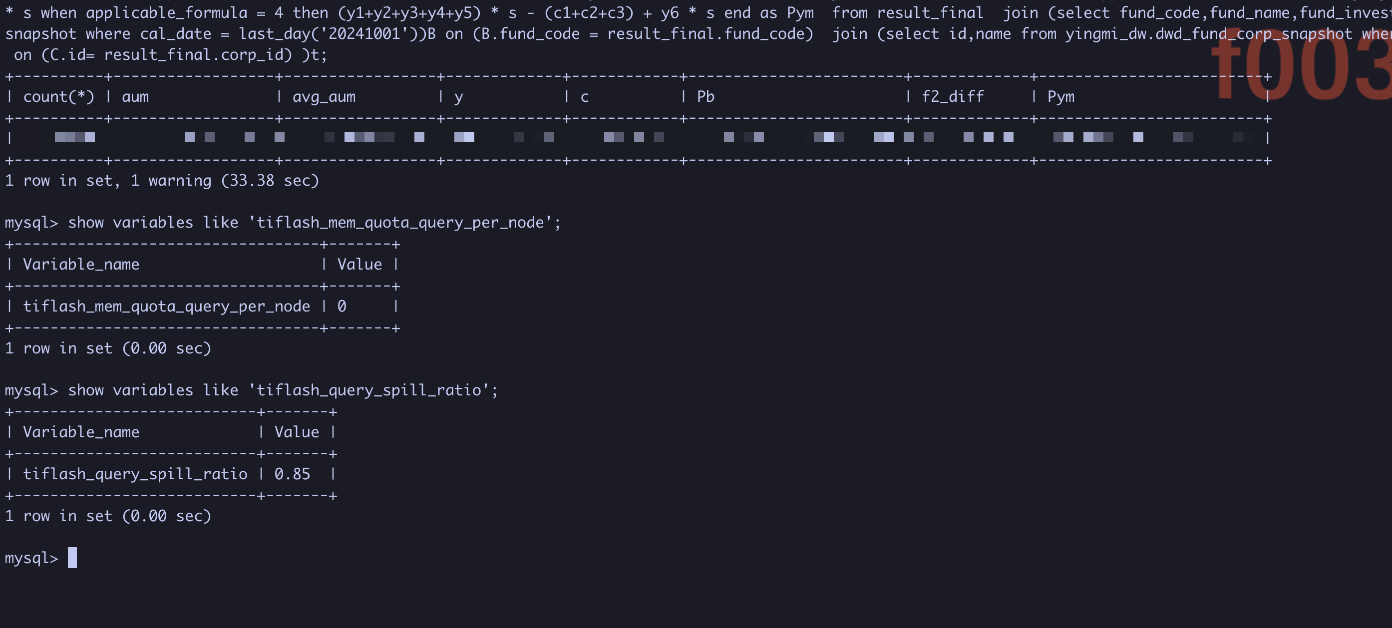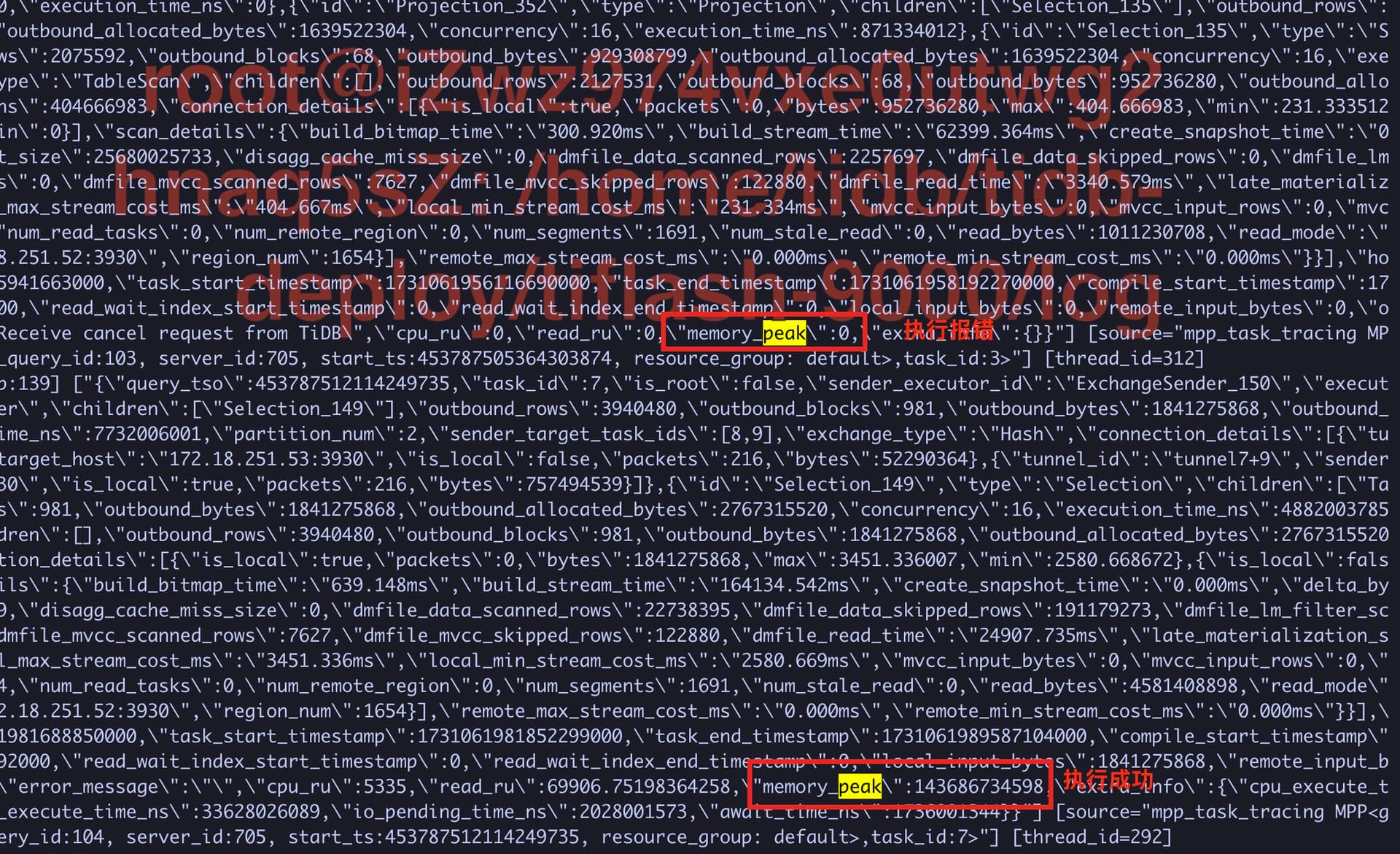 后查询报错:ERROR 1105 (HY000): other error for mpp stream: Code: 0, e.displayText() = DB::Exception: Receiver state: ERROR, error message: Exchange receiver meet error : Code: 0, e.displayText() = DB::Exception: Receiver state: ERROR, error message: Code: 0, e.displayText() = DB::Exception: Receiver state: ERROR, error message: Code: 0, e.displayText() = DB::Exception: Memory limit (for query) exceeded caused by 'out of memory quota for data computing' : would use 60.00 GiB for data computing (attempt to allocate chunk of 1114112 bytes)