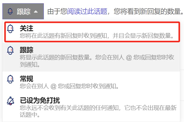 这个选项卡,选择关注/跟踪,特别是关注,在帖子有任何新回复的时候就会通知你。这个比回复来mark要好用很多。建议以往需要通过回复mark的,使用这个功能。