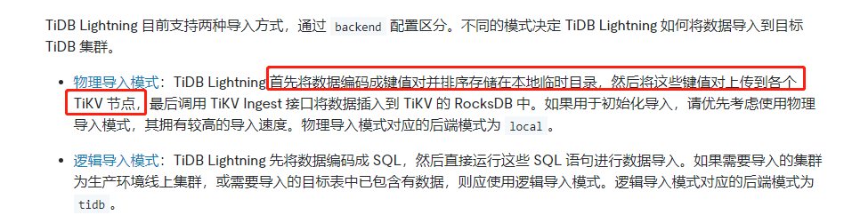 TiDB lightning 可以有物理导入和逻辑导入模式。
