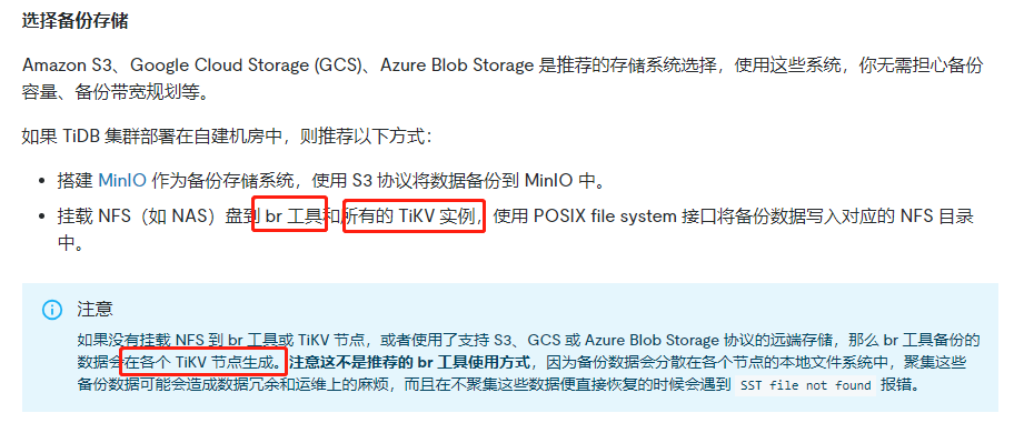 也就是说br工具很可能只认共享磁盘或者s3,GCS 或 Azure Blob Storage 协议的远端存储,本地目录不行,如果br节点和所有的tikv节点在同一台服务器上安装的,可能可以mkdir /backup直接备份。