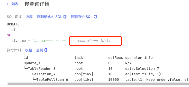 我只知道 TiDB 有个这个问题,就是记录带注释的 SQL 的时候会记录有点问题,一般也不影响用,像这样