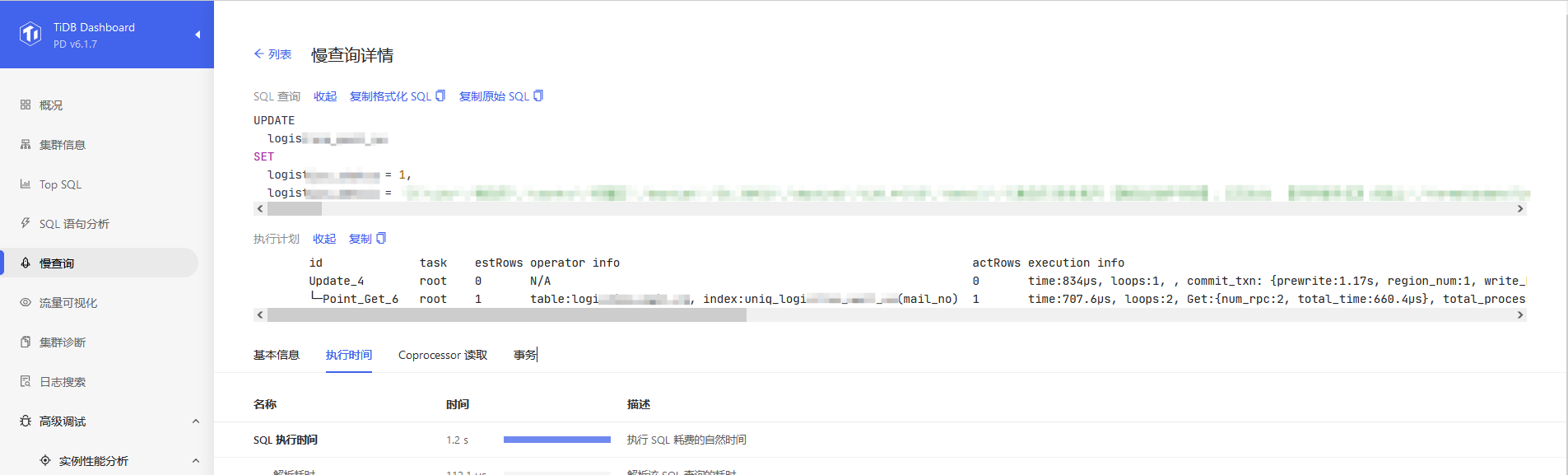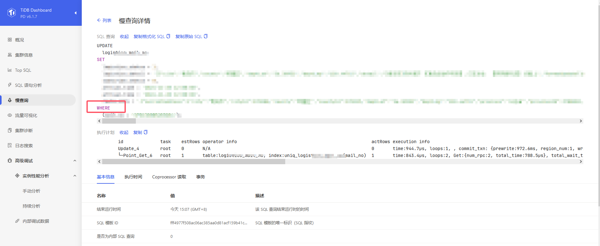按你页面显示的sql模板id去表里查下SELECT * FROM INFORMATION_SCHEMA.STATEMENTS_SUMMARY_HISTORY b WHERE b.DIGEST=‘b823d47ec2c34e7981f6c1823e44177b0ae108fc14cc10dc92b0e0264d3e4d3b’
