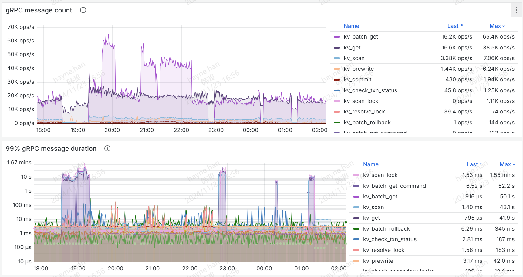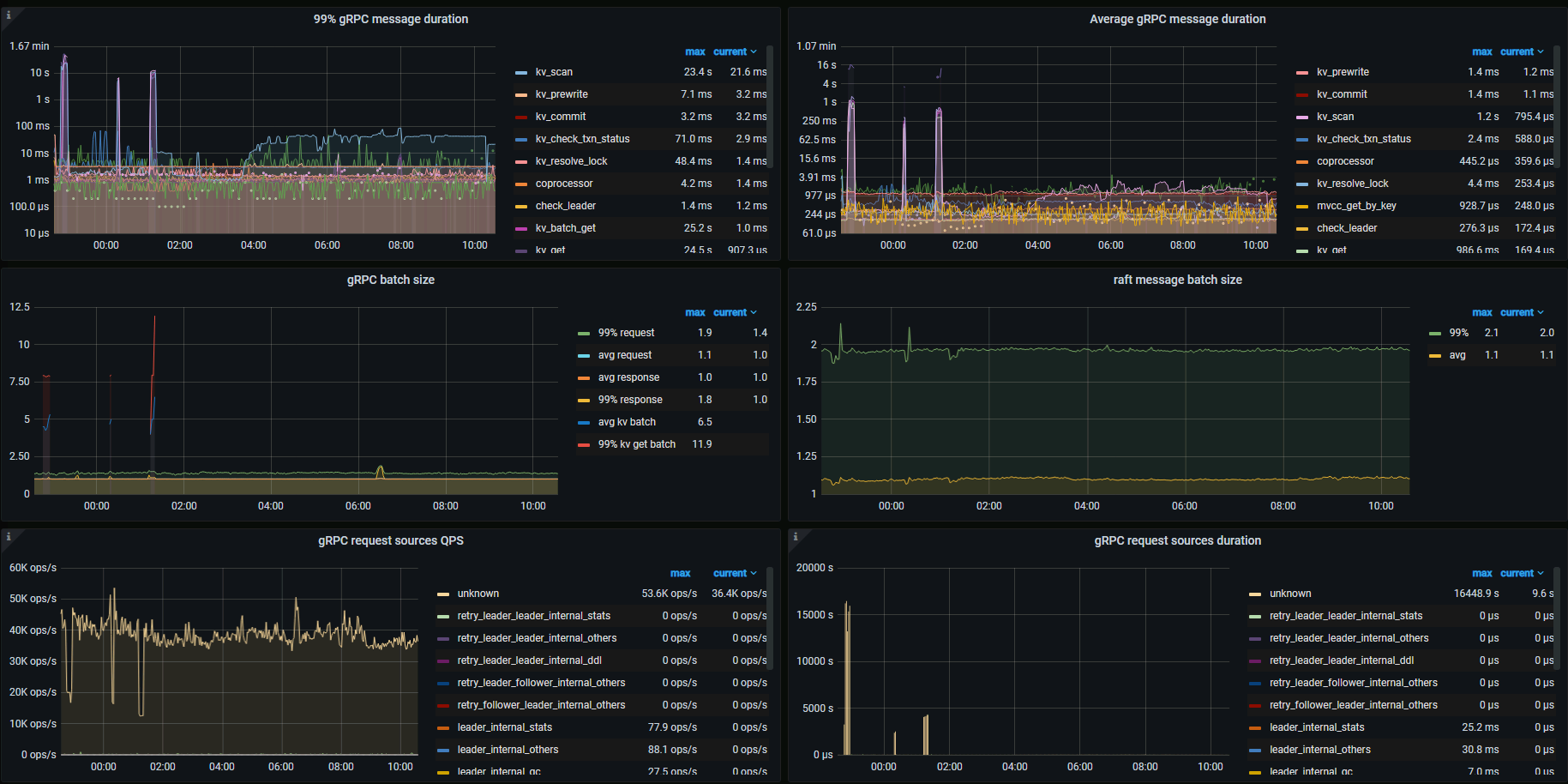 故障期间,gRPC message count 基本掉0了。gRPC batch size 比较大,前后的 batch get 比较多。
