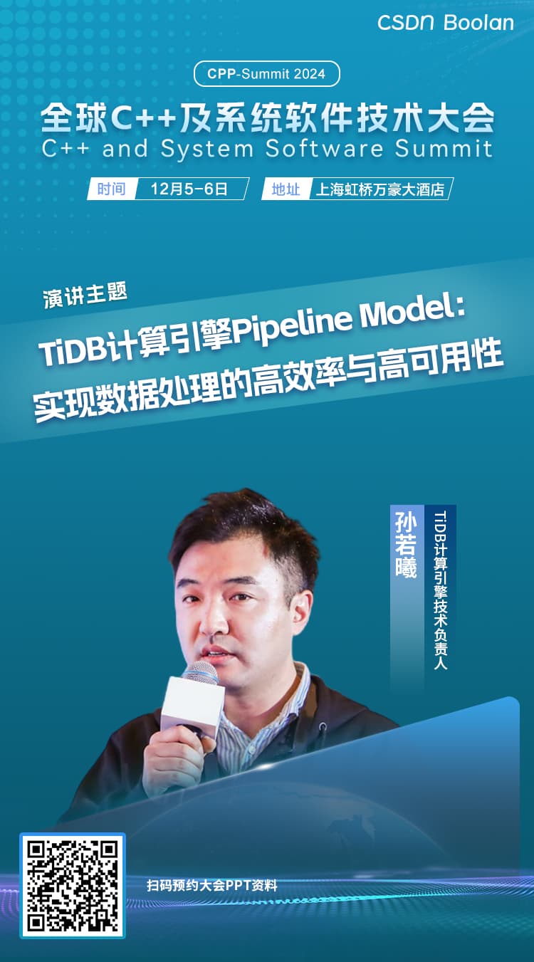 系统级软件是数字世界的基础设施,C++ 自 1985 年由 Bjarne Stroustrup 博士在贝尔实验室发明以来,一直被誉为系统级编程“皇冠上的明珠”。秉承“全球专家、卓越智慧”的理念,由 CSDN&Boolan 举办的「2024 全球 C++ 及系统软件技术大会」将于 12 月 5 - 6 日在上海虹桥万豪大酒店正式举办。TiDB 计算引擎技术负责人孙若曦老师 将于 12 月 6 日 13:30-14:20 进行「 TiDB 计算引擎 Pipeline Model:实现数据处理的高效率与高可用性」主题分享。