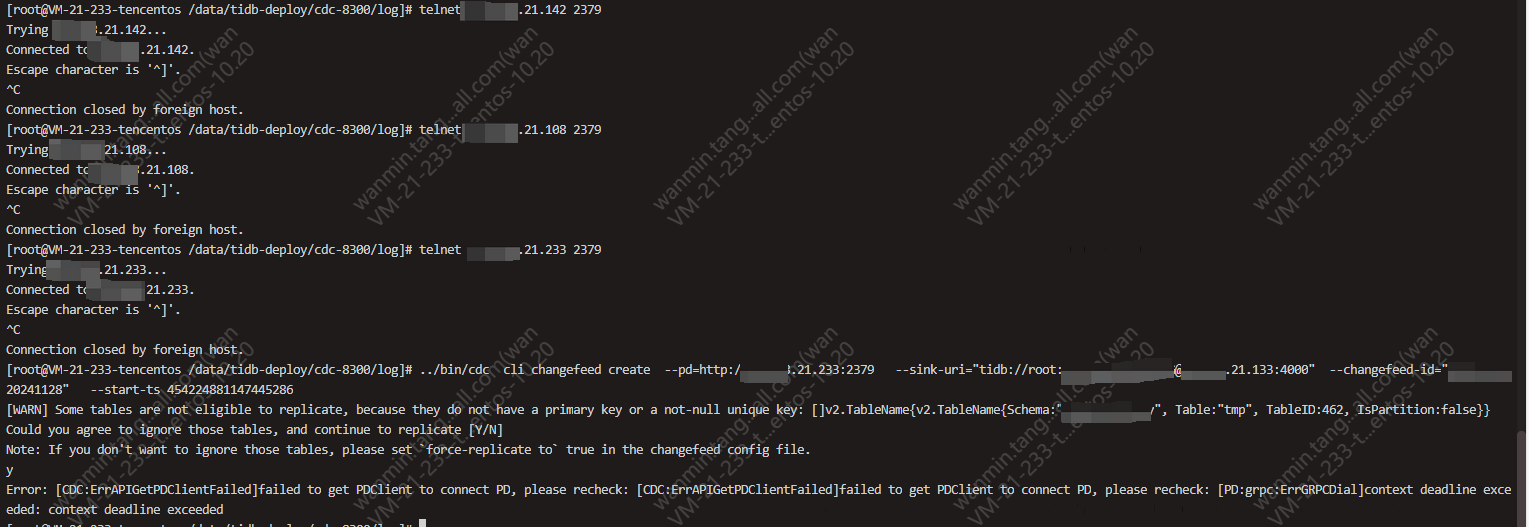…/bin/cdc cli changefeed create --pd=http://xx.xx.21.233:2379 --sink-uri=“tidb://root:xxxx@xx .xx.21.133:4000” --changefeed-id=“xxxx-20241128” --start-ts 454224881147445286