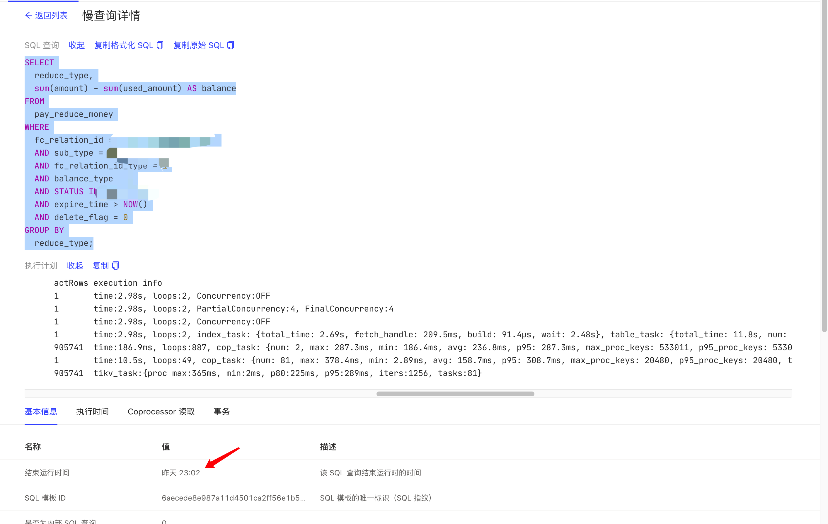 | ├─IndexRangeScan_12(Build) | 0.00 | 0 | cop[tikv] | table:t, partition:P_LT_57, index:pms_bill_detail_acquirer_unp_t_l_idx4(bill_date, partition_id, third_party_pid, card_acceptor_key) | time:708.6µs, loops:1, cop_task: {num: 1, max: 640.8µs, proc_keys: 0, rpc_num: 1, rpc_time: 603.4µs, copr_cache_hit_ratio: 0.00, distsql_concurrency: 15}, tikv_task:{time:0s, loops:1}, scan_detail: {total_keys: 1, get_snapshot_time: 34.4µs, rocksdb: {block: {cache_hit_count: 4}}} | range:[“20240209” 56 “UZJXTHO” “2089991527100F2”,“20240209” 56 “UZJXTHO” “2089991527100F2”], keep order:false, stats:pseudo | N/A | N/A |