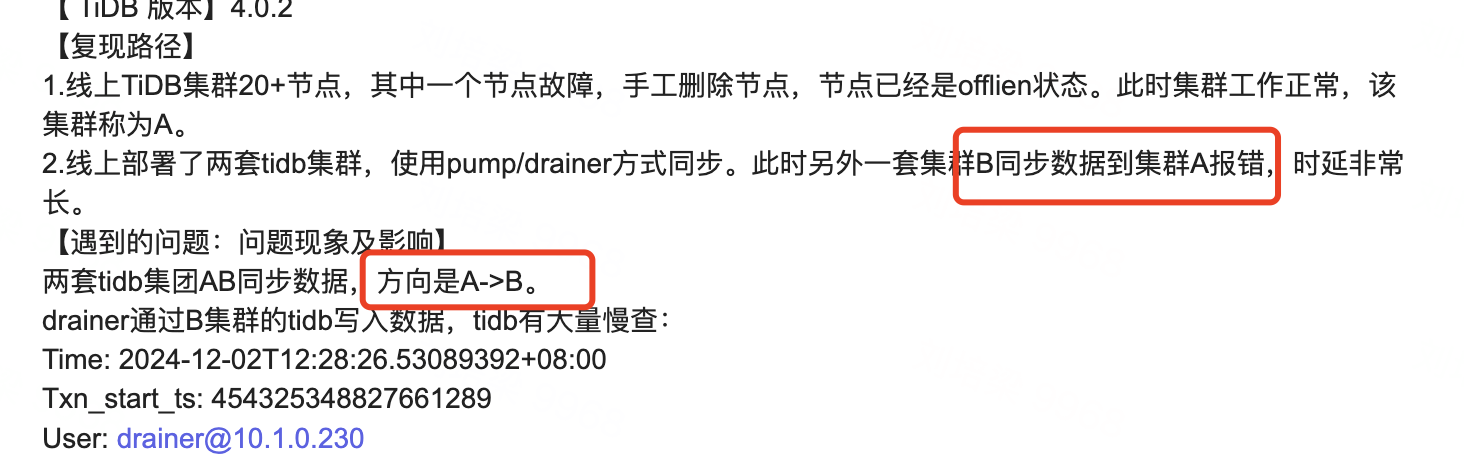 2.线上部署了两套tidb集群,使用pump/drainer方式同步。此时另外一套集群B同步数据到集群A报错,时延非常长。