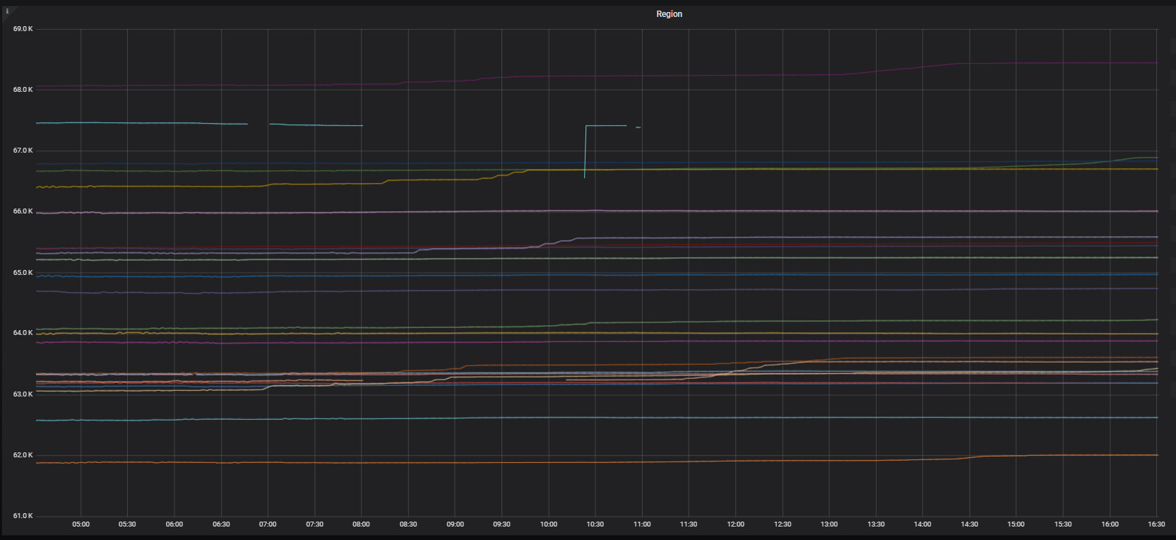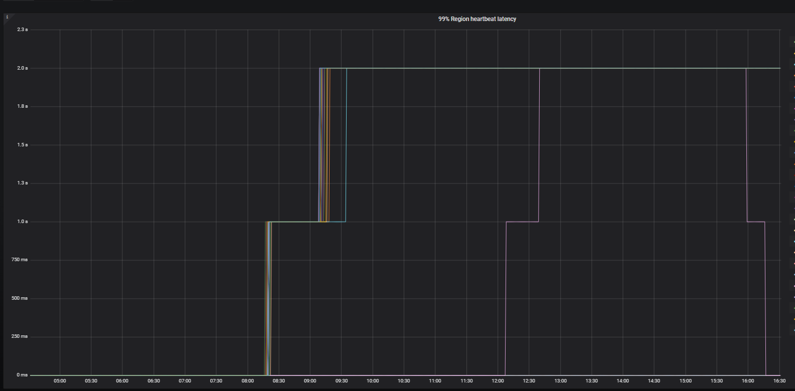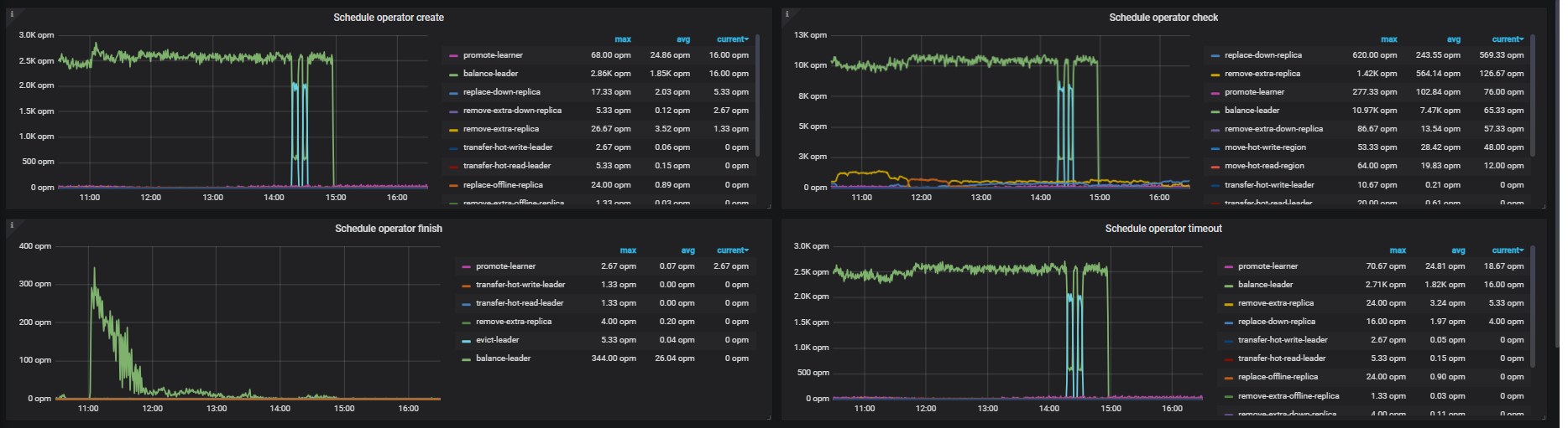 - 从 operator 看 15:00 就没产生新的调度了,但是 finish duration 很长,可以再看下 heartbeat 部分 tikv 上报心跳是否有超时和 pending