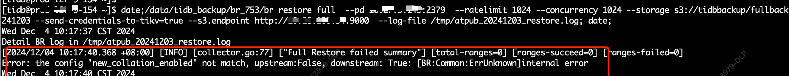 2. 把备份数据还原到集群B版本7.5.3 出错 ,‘new_collation_enabled’ not match