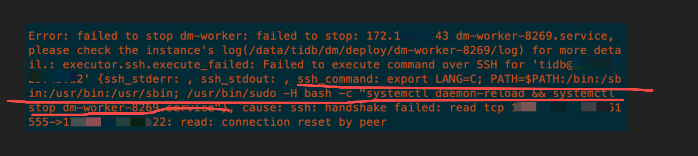 在目标节点执行下 systemctl daemon-reload ,然后再试一试,如果不行,就手动在目标节点执行systemctl stop dm-worker-8269.service,看看手动执行是否成功
