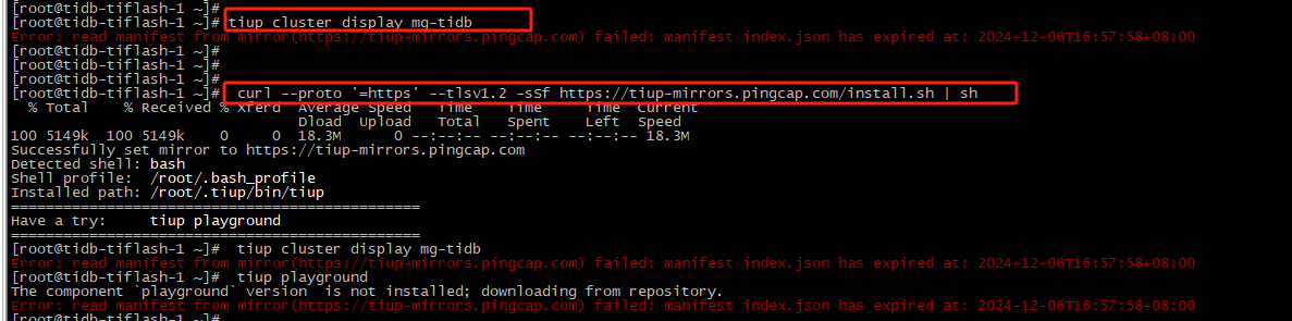 出现报错:Error: read manifest from mirror(https://tiup-mirrors.pingcap.com) failed: manifest index.json has expired at: 2024-12-06T16:57:58+08:00