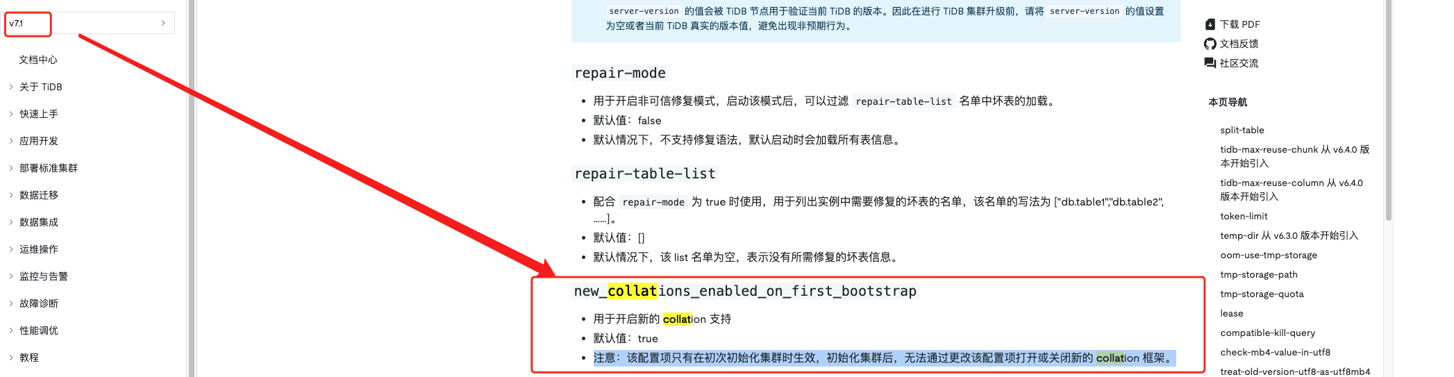 谢谢回答噢,还有一点疑问帮忙解答下:new_collations_enabled_on_first_bootstrap参数的主要作用是在 TiDB 集群初次初始化时启用新的排序规则框架,以提供更好的 MySQL 兼容性和语义上的支持。那之前集群就是false的,升级后还是false的影响是?如何解决的?