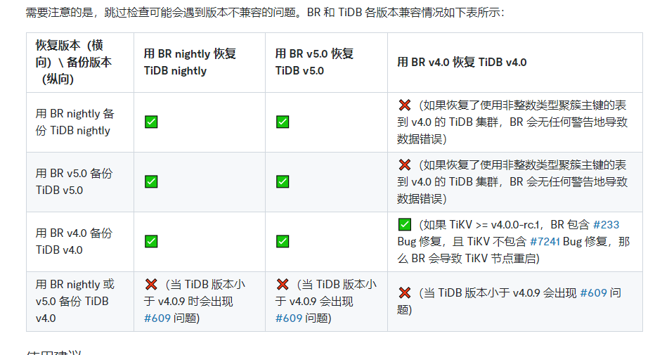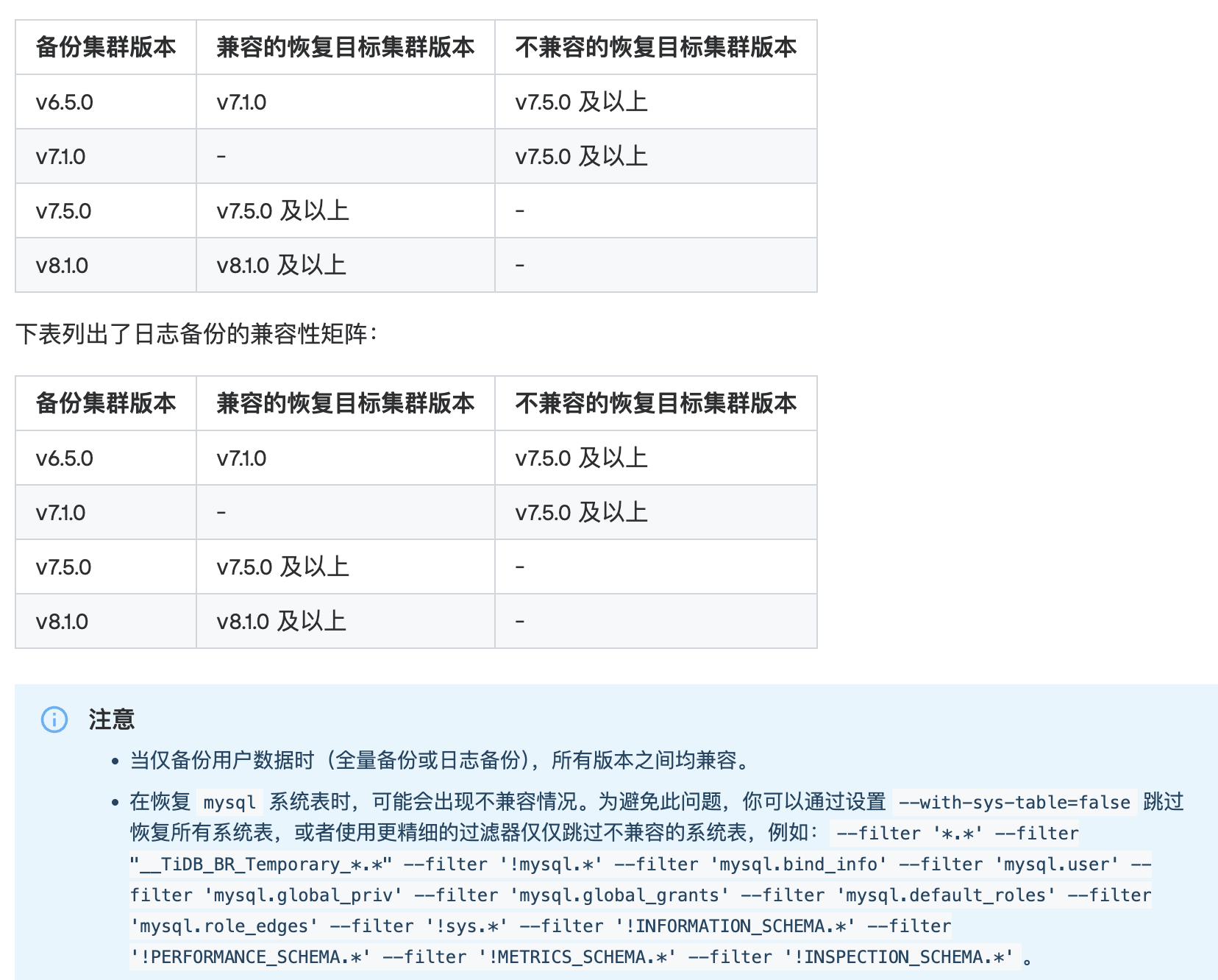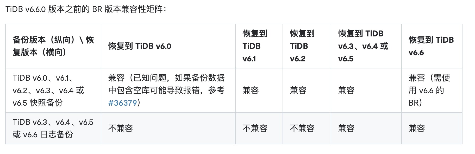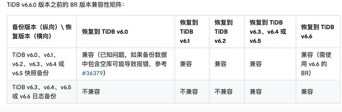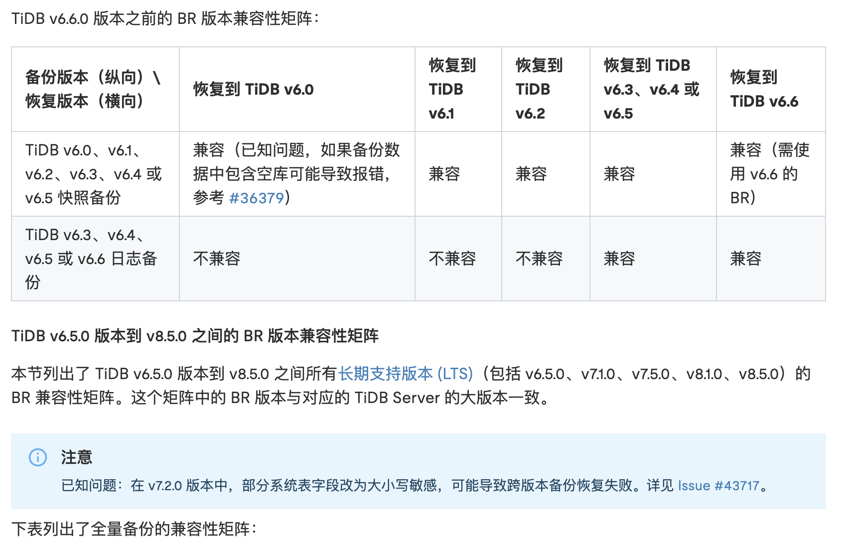 问题相关链接:https://docs.pingcap.com/zh/tidb/stable/backup-and-restore-overview#版本间兼容性
