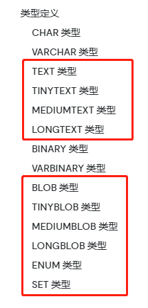 text、tinytext、mediumtext、longtext、blob、tinyblob、mediumblob、longblob