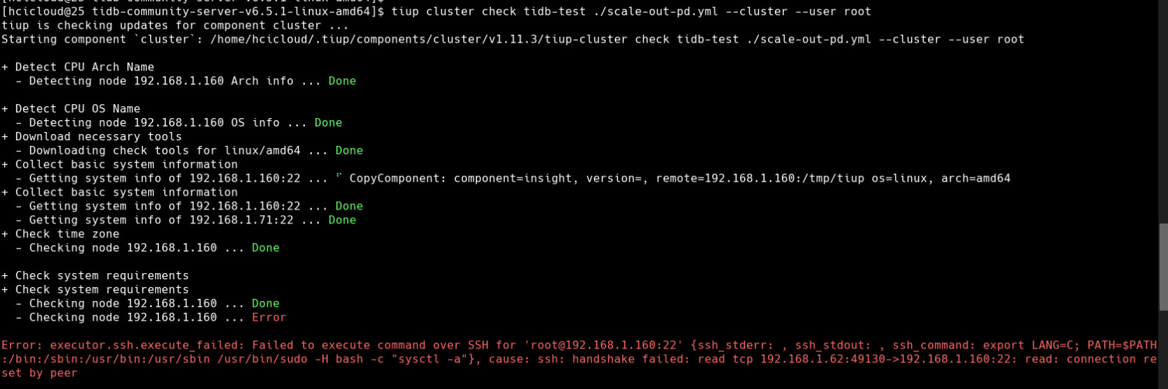 在生产环境中,tiup版本是1.11.3,中控机时192.168.1.62,部署tiup的用户是hcicloud,目标机是192.168.1.160,需要在目标机上扩容一个tikv节点,在执行tiup cluster check tidb-test ./scale-out-pd.yml --cluster --user root 的时候,提示报错 Error: executor.ssh.execute_failed: Failed to execute command over SSH for ‘root@192.168.1.160:22’ {ssh_stderr: , ssh_stdout: , ssh_command: export LANG=C; PATH=$PATH:/bin:/sbin:/usr/bin:/usr/sbin /usr/bin/sudo -H bash -c “sysctl -a”}, cause: ssh: handshake failed: read tcp 192.168.1.62:49130->192.168.1.160:22: read: connection reset by peer,