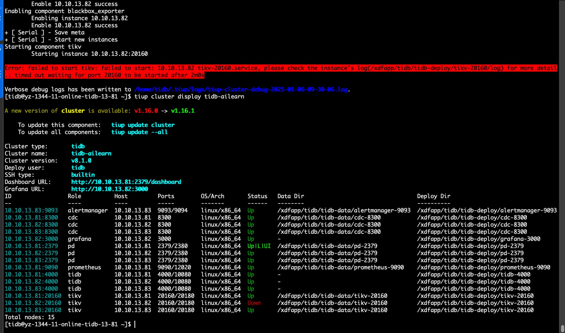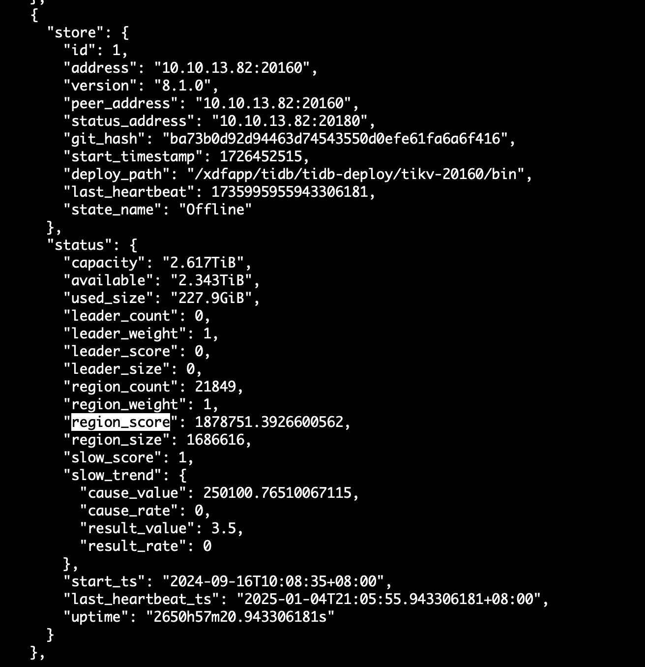 [2025/01/06 09:32:02.194 +08:00] [FATAL] [server.rs:1037] [“failed to start node: Other("[components/pd_client/src/util.rs:952]: duplicated store address: id:202791 address:\"10.10.13.82:20160\" version:\"8.1.0\" peer_address:\"10.10.13.82:20160\" status_address:\"10.10.13.82:20180\" git_hash:\"ba73b0d92d94463d74543550d0efe61fa6a6f416\" start_timestamp:1736127122 deploy_path:\"/xdfapp/tidb/tidb-deploy/tikv-20160/bin\" , already registered by id:1 address:\"10.10.13.82:20160\" version:\"8.1.0\" peer_address:\"10.10.13.82:20160\" status_address:\"10.10.13.82:20180\" git_hash:\"ba73b0d92d94463d74543550d0efe61fa6a6f416\" start_timestamp:1726452515 deploy_path:\"/xdfapp/tidb/tidb-deploy/tikv-20160/bin\" last_heartbeat:1735995955943306181 node_state:Serving ")”] [thread_id=1]