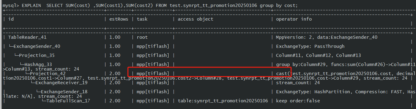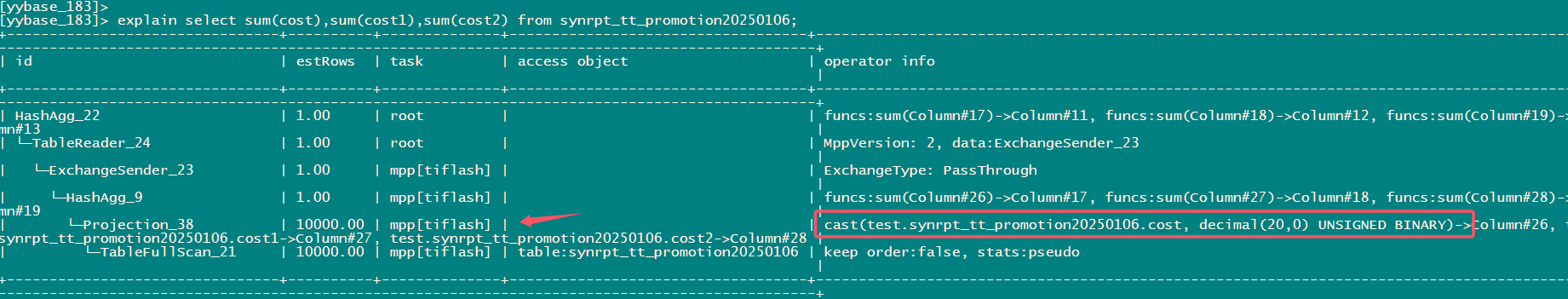 如果精度差异过大,导致其映射的 tiflash 内部实现不一致的话,是会加 cast的,比如 decimal(10, 2) join decimal(8,2), 是会把 decimal(8,2) cast 成 decimal(10,2) 的