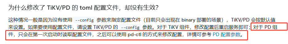 针对 PD 可在线修改的配置项,成功修改后则会持久化到 etcd 中,不会对配置文件进行持久化,后续以 etcd 中的配置为准。