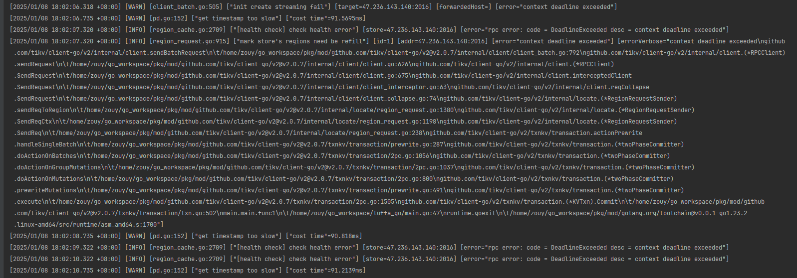 pd的leader没有掉,我有三台tikv,但我发现每次调用的tikv都是47.236.143.140这台,然后我将他手动下线后,大概过了好几分钟才换的101.32.10.67,换101.32.10.67区间一直都是报错