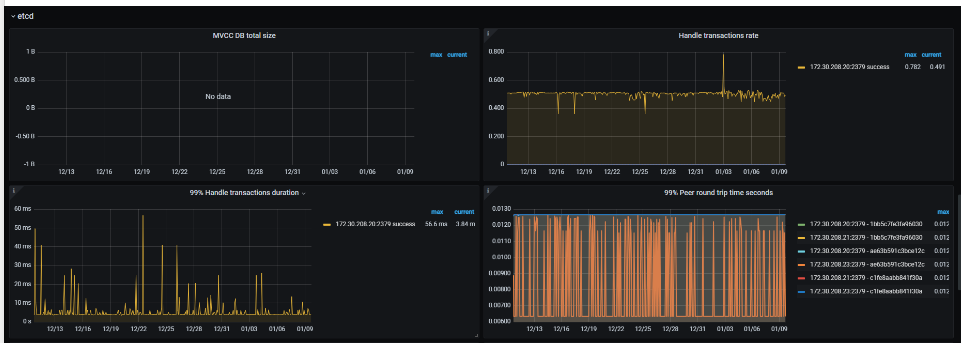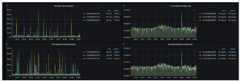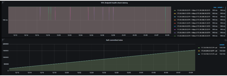 从目前已提供的信息,有一个疑点是 etcd 写延迟导致的。可以把 PD 的 etcd “99% Handle transactions duration” PromSQL 里的 0.99 改成 0.999999,然后与 TSO 的延迟对照,看是否相关