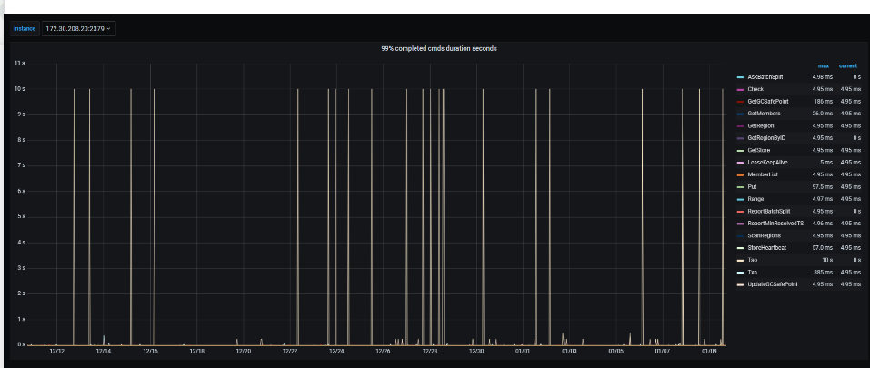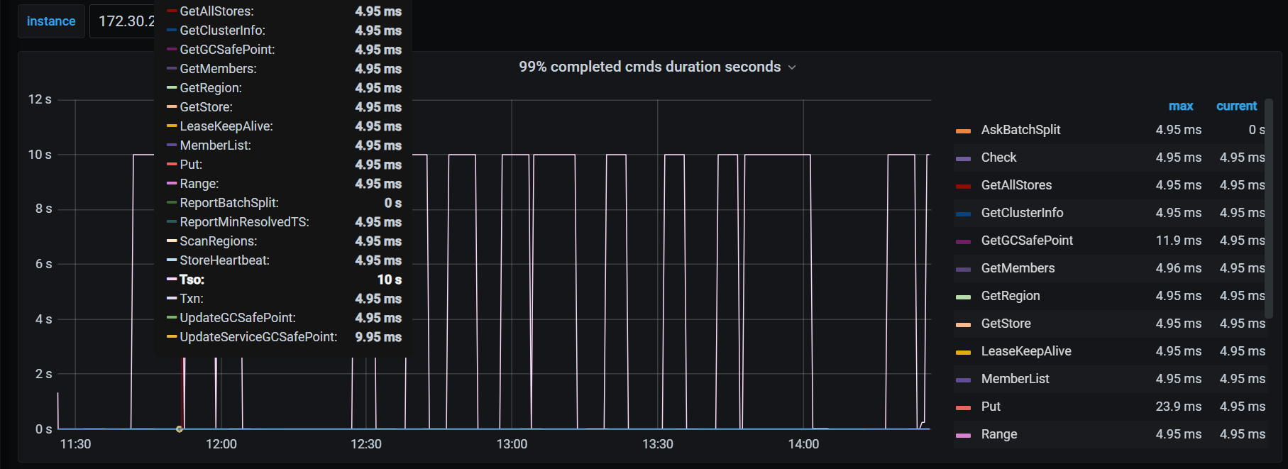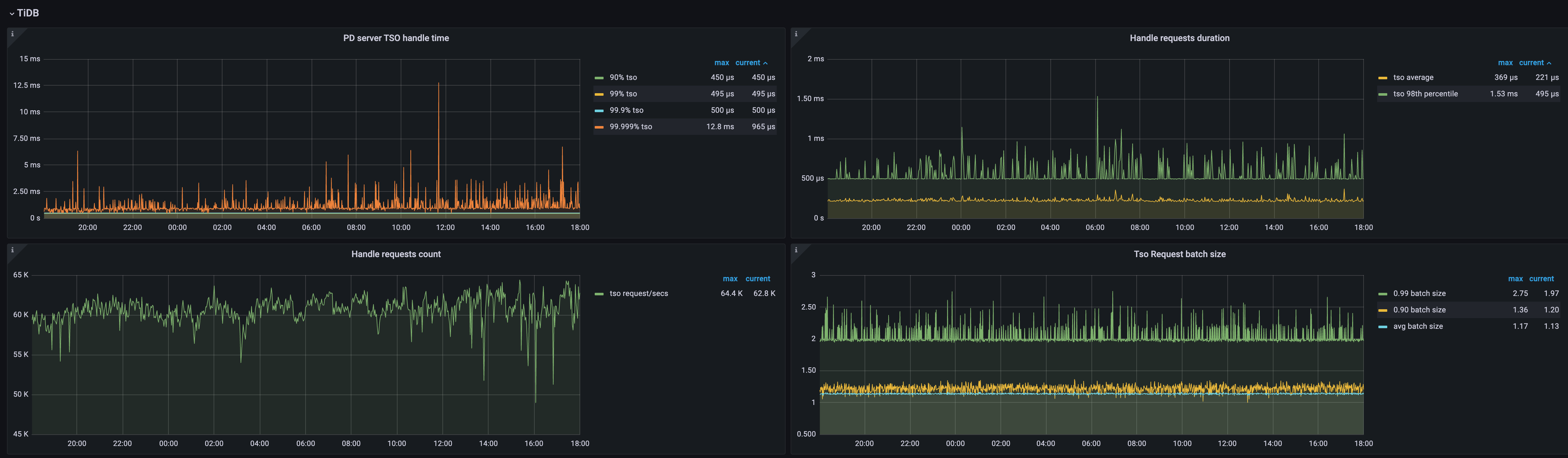 如果不是这里的原因,就只能在更大范围的数据里寻找线索了。建议提供 2~3 天的 PD 监控和日志,其中覆盖 2~3 次 TSO 延迟达到 10s 的情况。可以通过 clinic 采集,参考 https://pingkai.cn/tidbcommunity/forum/t/topic/272957