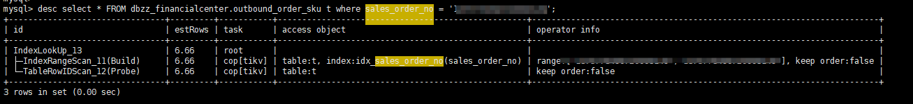 | └─Selection_6 | 6.67 | 1 | cop[tiflash] | | tikv_task:{proc max:1.32s, min:73.7ms, p80:433.8ms, p95:538.9ms, iters:1, tasks:2194} | eq(dbzz_financialcenter.outbound_order_sku.sales_order_no, "3127937763871982738") | N/A | N/A |