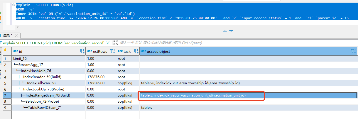 【遇到的问题:问题现象及影响】 如 图中 v 表中 字段 vaccination_unit_id 和字段creation_time 分别是两个索引,执行计划中只走了 index:idx_vaccr_vaccination_unit_id(vaccination_unit_id) 一个索引,将语句修改后 又只走了 table:v, index:idx_vaccr_creation_time(creation_time)这个索引