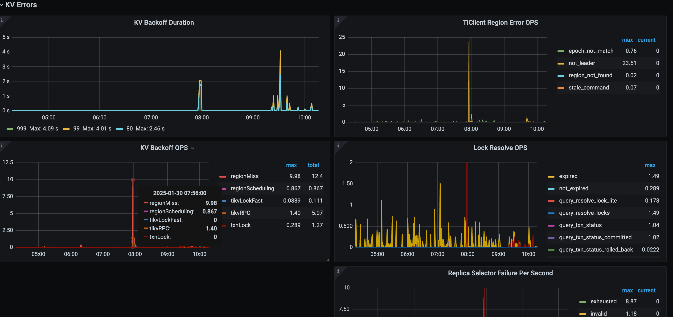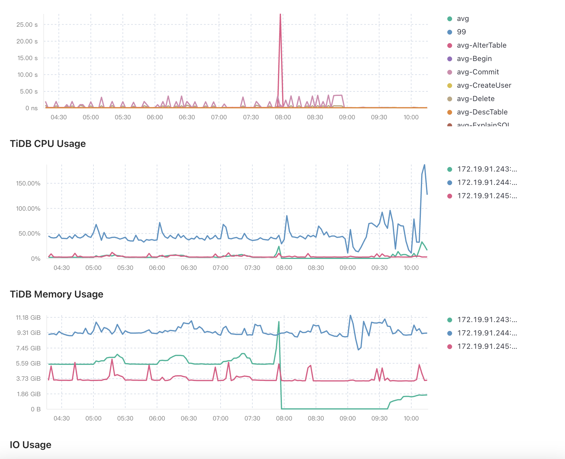 从图中信息看的话,感觉在7点55到8点有altertable操作,导致io超高,把服务拉挂了,所以检查下这个时间的alter和analyze