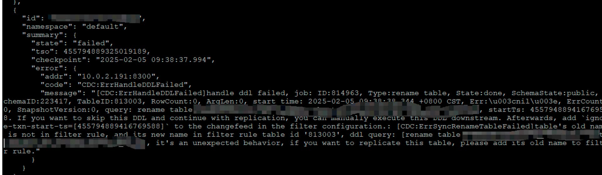 按照错误提示,我在下游tidb集群,手动操作了rename操作。