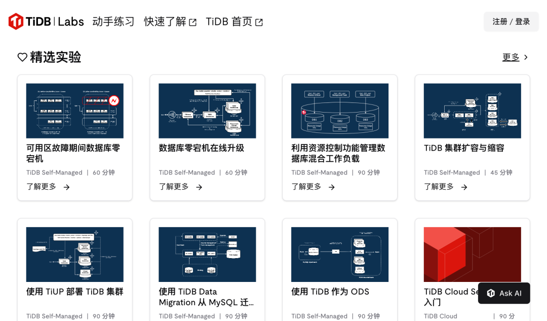 30+ 精选实验,从容灾、高可用、可扩展性、数据迁移、向量功能、零宕机在线升级、高可用、SQL 调优到应用构建等等,都可以在 Lab 上感受到 TiDB 的魅力!还可以利用 TiDB.AI 工具辅助你的学习。