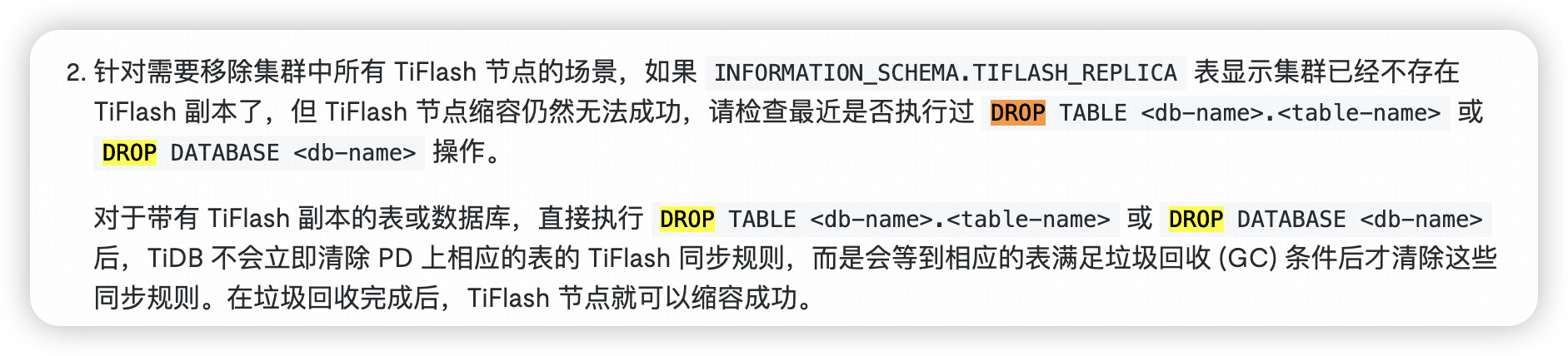【复现路径】新建tidb v8.5.1 版本的集群,并扩容了tiflash 服务为一些表设置了 tiflash replica 1操作。后来操作吧 一个database 给drop了(drop database db_name), 在把剩余的几个存在 replica 的表replica 设置为0。过来很长时间,发现tiflash 上还是存在大量的region。
