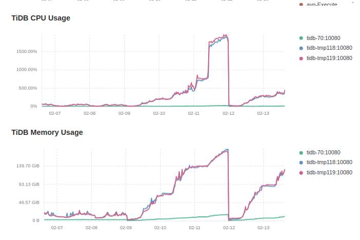 从tidb v6.5.11升级到v7.5.5后,随着运行时间的推移,tidb实例的内存和cpu不断走高,在凌晨低谷期也没有回落的趋势,影响系统正常使用.通过reload tidb节点后,内存和cpu可以降下来.