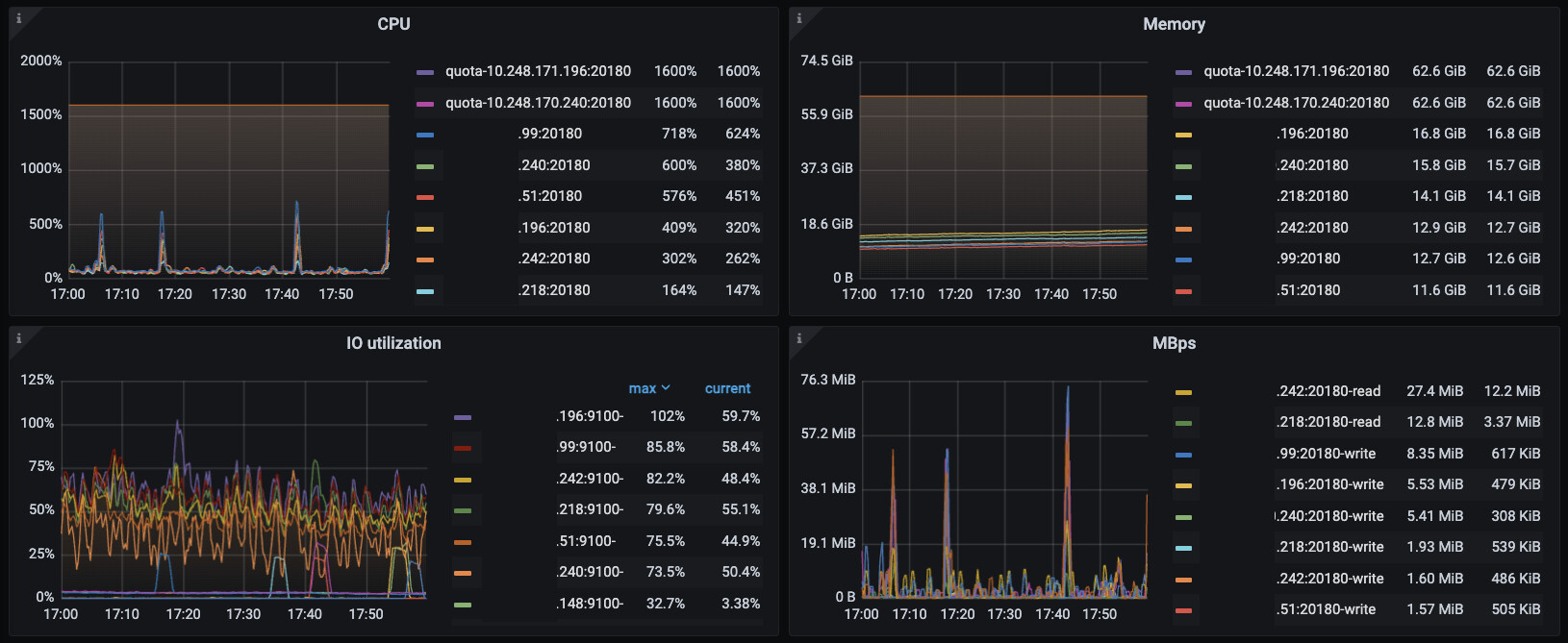 我个人理解是出现了读取热点,而且分配不均匀,但是查看监控后我发现TiKV的CPU、Memory、IO都没有打满(30秒的查询发生在17:42左右,有一个明显的上涨,但没有到达最大)