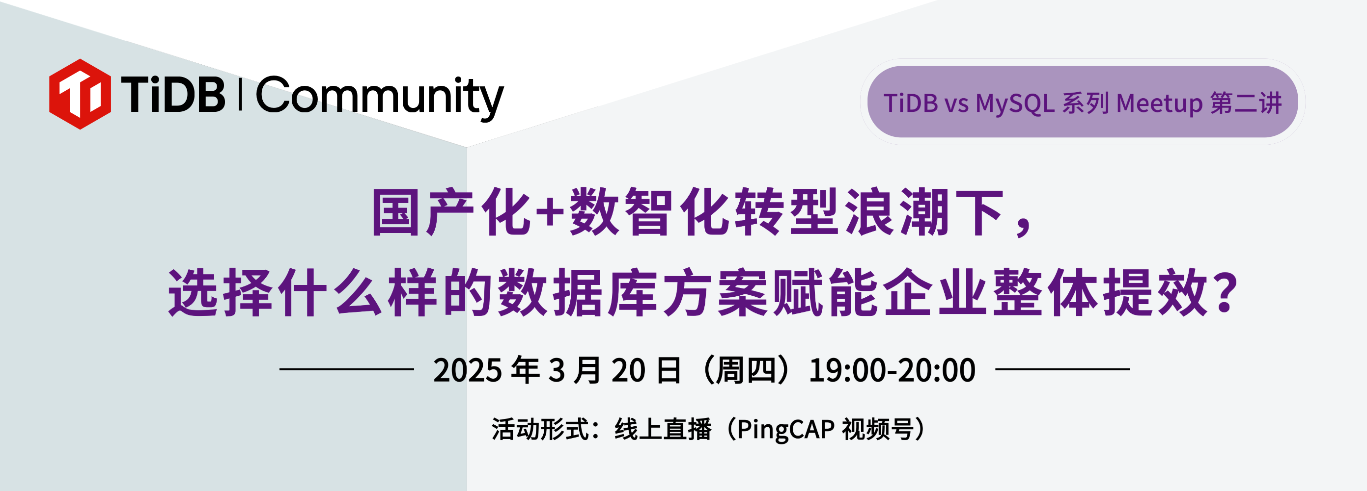 2025 年,TiDB 社区特别策划了“TiDB vs MySQL:国产数据库替换 & 降本增效的不二选择 ”系列线上 Meetup ,从不同视角、不同需求、业务形态、技术演进等多个维度和大家一起聊透国产数据库选型,也希望通过这一系列活动让大家更好地了解 TiDB,看看 TiDB 是否能帮到你解决目前面临的技术架构难题,为大家排忧解难。