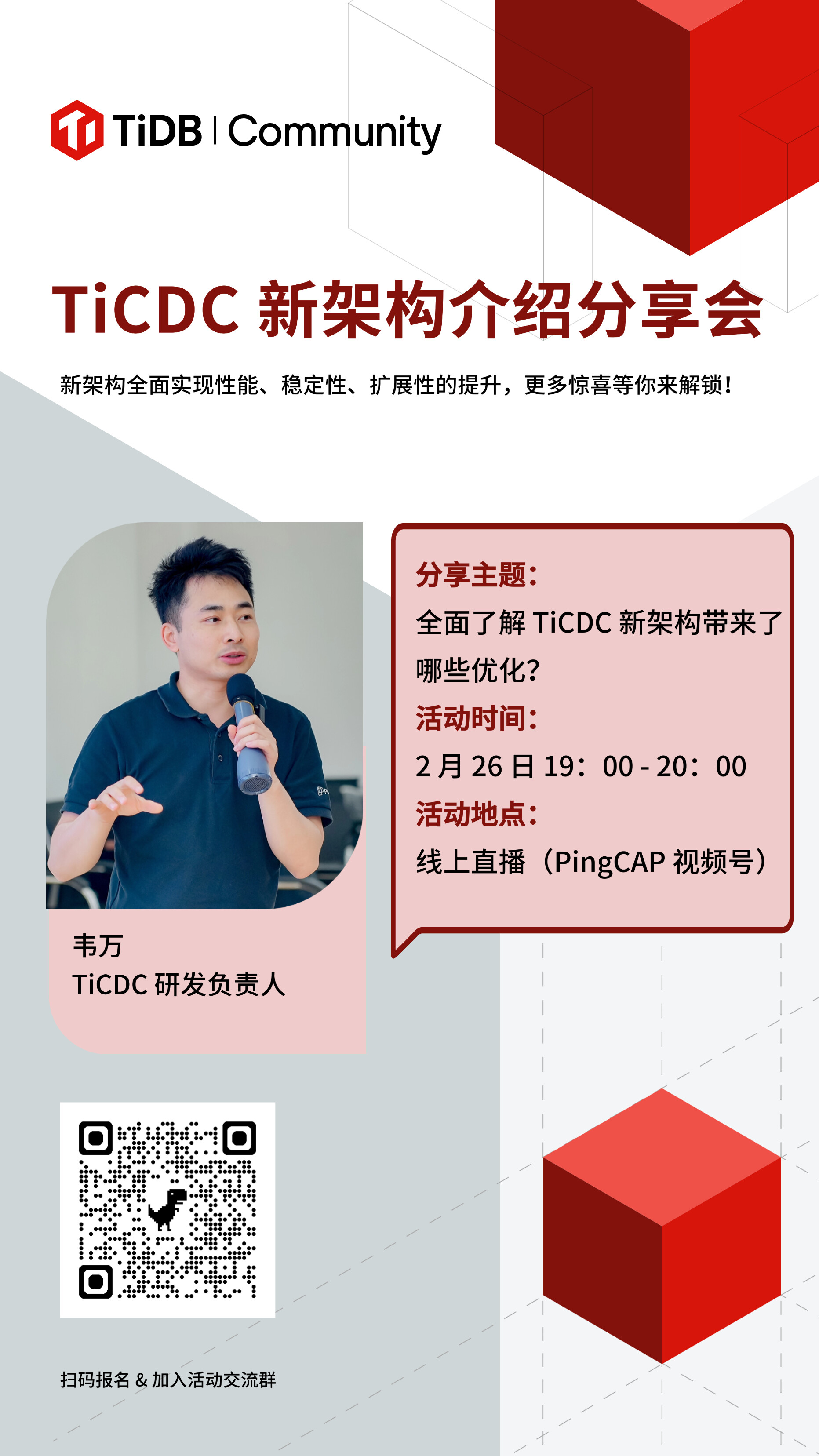 本周三晚!TiCDC 新架构介绍分享会敬请期待!