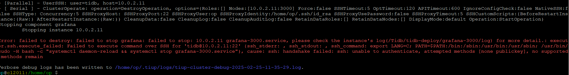 $HOME/.tiup 文件也是从别的机器copy过来的,前几天还可以正常scale-in 结点,今天尝试 scale-in节点时,出现了验证错误。按照 https://docs.pingcap.com/zh/tidb/stable/tiup-troubleshooting-guide#21-部署过程中提示-unable-to-authenticate-attempted-methods-none-publickey 官网俩你今儿,不能解决问题。