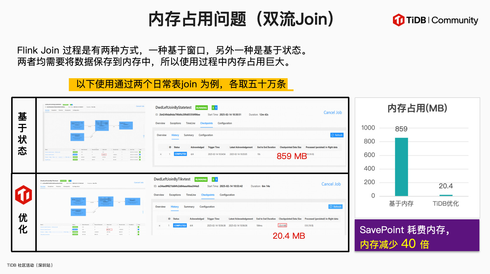 - 话题概要:马飞老师分享了基于TiDB+Flink构建低成本实时数仓的创新实践。针对传统Flink双流Join内存占用高(如50万级数据达859MB)、数据一致性难保障等痛点,团队通过架构迭代提出解决方案:利用TiKV替代Redis实现状态存储,TiCDC捕获增量数据替代Kafka,并通过自研Supply Join方法重构计算链路——将Join过程拆解为主键传递与字段填充,使内存占用降低40倍(至20.4MB),同时支持SQL解析实现低代码开发。该架构依托TiDB HTAP特性,实现全量数据TiKV Scan+增量数据TiCDC的准实时处理,资源成本下降60%,并通过状态复用与物化视图简化数据血缘治理。未来计划深度融合TiDB与Calcite优化物化视图能力,进一步提升实时数仓在复杂关联场景下的性能与时效性。