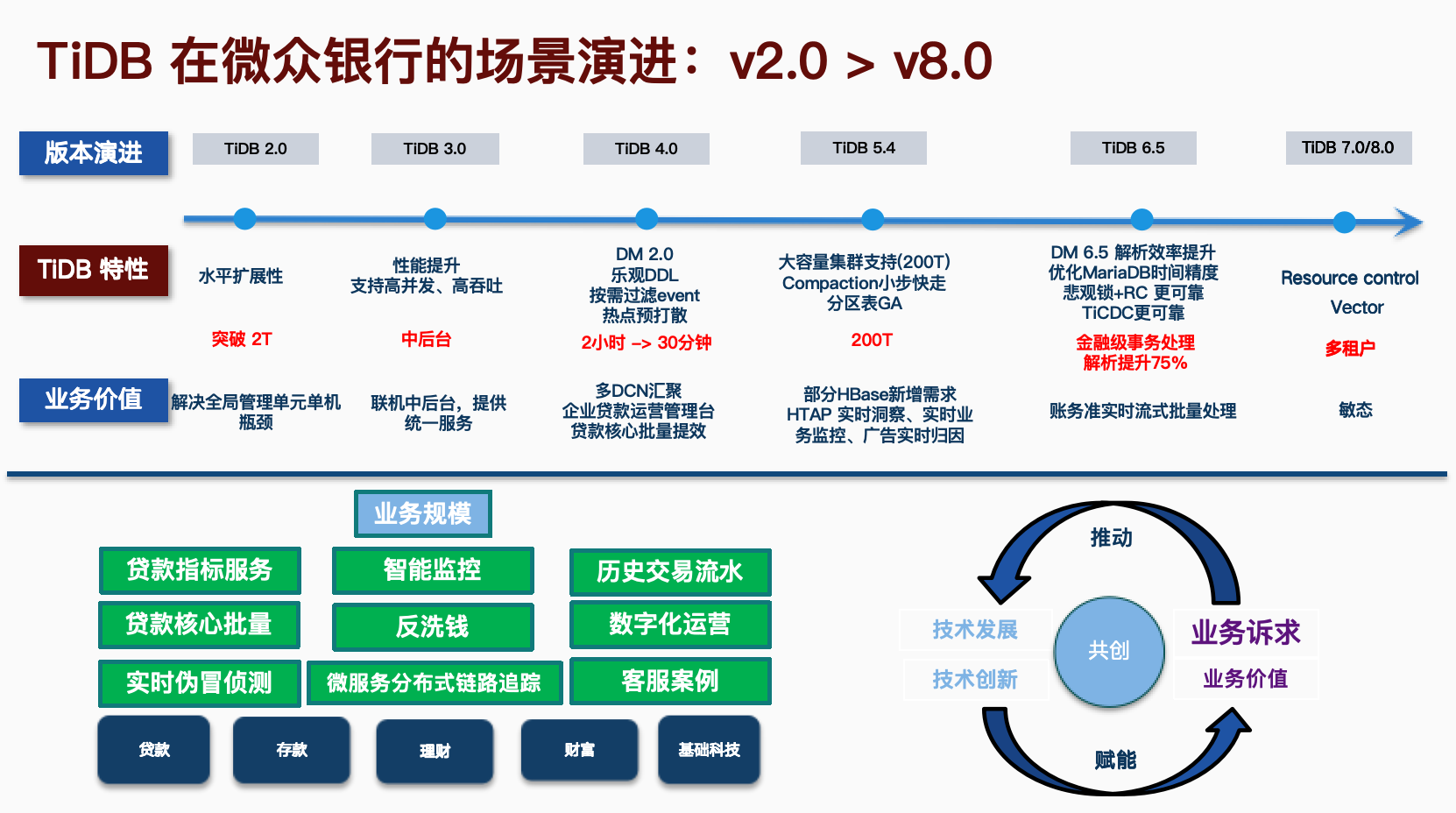 - 话题概要: 微众银行黄蔚老师分享了 TiDB 在金融场景的大规模运维实践与稳定性保障体系。面对80+集群、1.3PB数据量及370+子系统的复杂场景,微众构建了 TDSQL 与 TiDB 混合架构:3TB以下业务采用TDSQL主从架构,大容量核心批量及200TB级集群则依托TiDB实现透明水平扩展。通过自研智能运维体系,实现多维度保障:集中管控平台支持慢查询实时诊断与容量预测;自动化巡检覆盖40+检查项;DM数据校验平台实现7*24小时多粒度数据一致性验证。关键创新包括:基于Resource Control的OLTP/OLAP资源隔离,结合Placement Rules实现冷热数据分层存储,降低30%资源争抢。未来将深化资源控制、向量化能力及全链路故障定位,持续推动国产化架构降本增效。