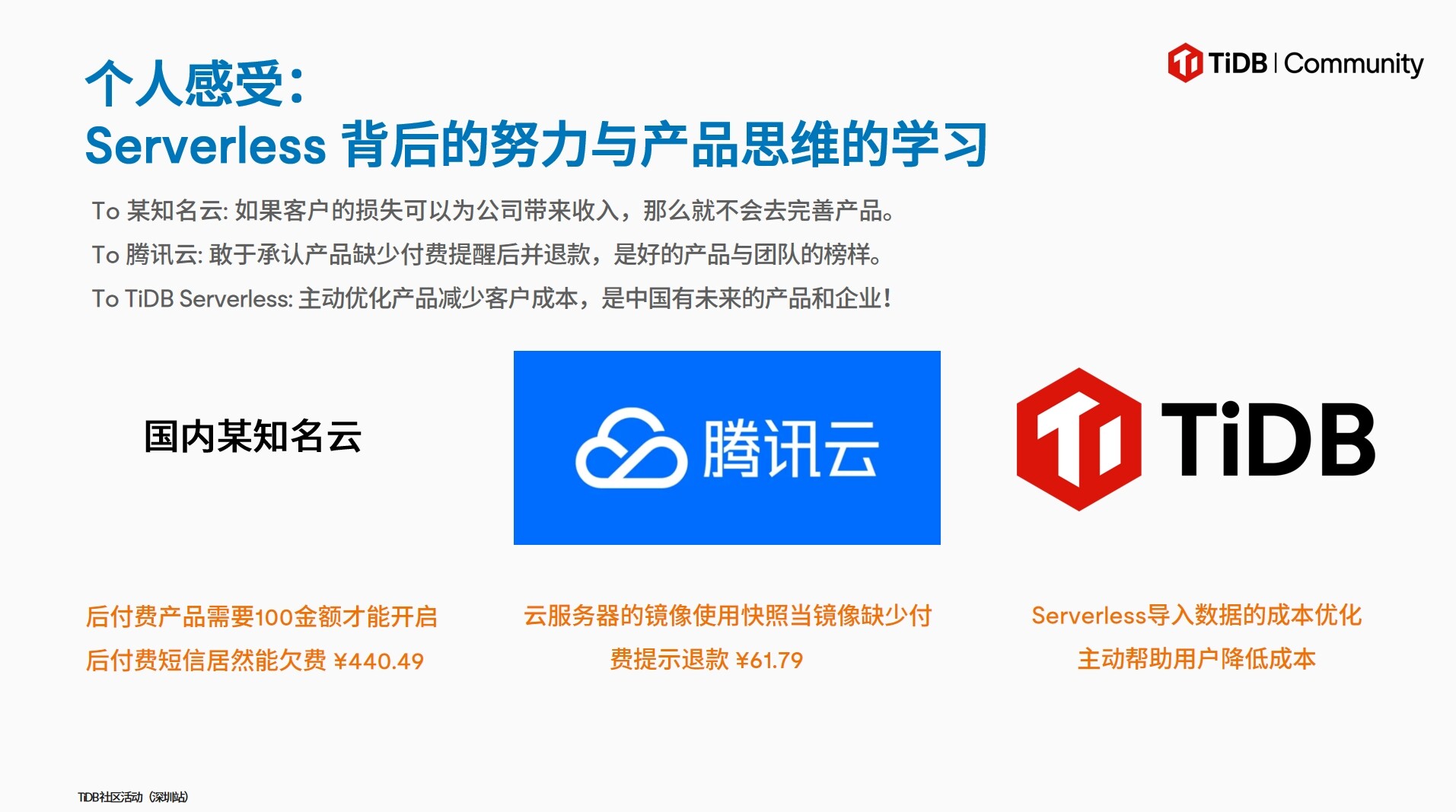 话题概要:王老师(Steve)分享了借助TiDB Cloud Serverless实现跨境电商业务低成本高效开发的经验。初创期从MySQL迁移至TiDB社区版解决了性能瓶颈,但面临大量的资源浪费。通过转用Serverless版本,结合弹性伸缩与按需计费,月均成本降低32.03%(对比原百度云支出),冷数据删除与SQL优化进一步减少冗余计算。架构上采用新加坡节点+香港API服务,通过CDN加速优化跨境访问延迟。实践表明,Serverless在非高峰时段自动缩容,资源利用率从90%峰值负载优化至合理区间,帮助团队聚焦产品迭代,运维成本趋近于零,为初创企业提供轻量化数据解决方案。