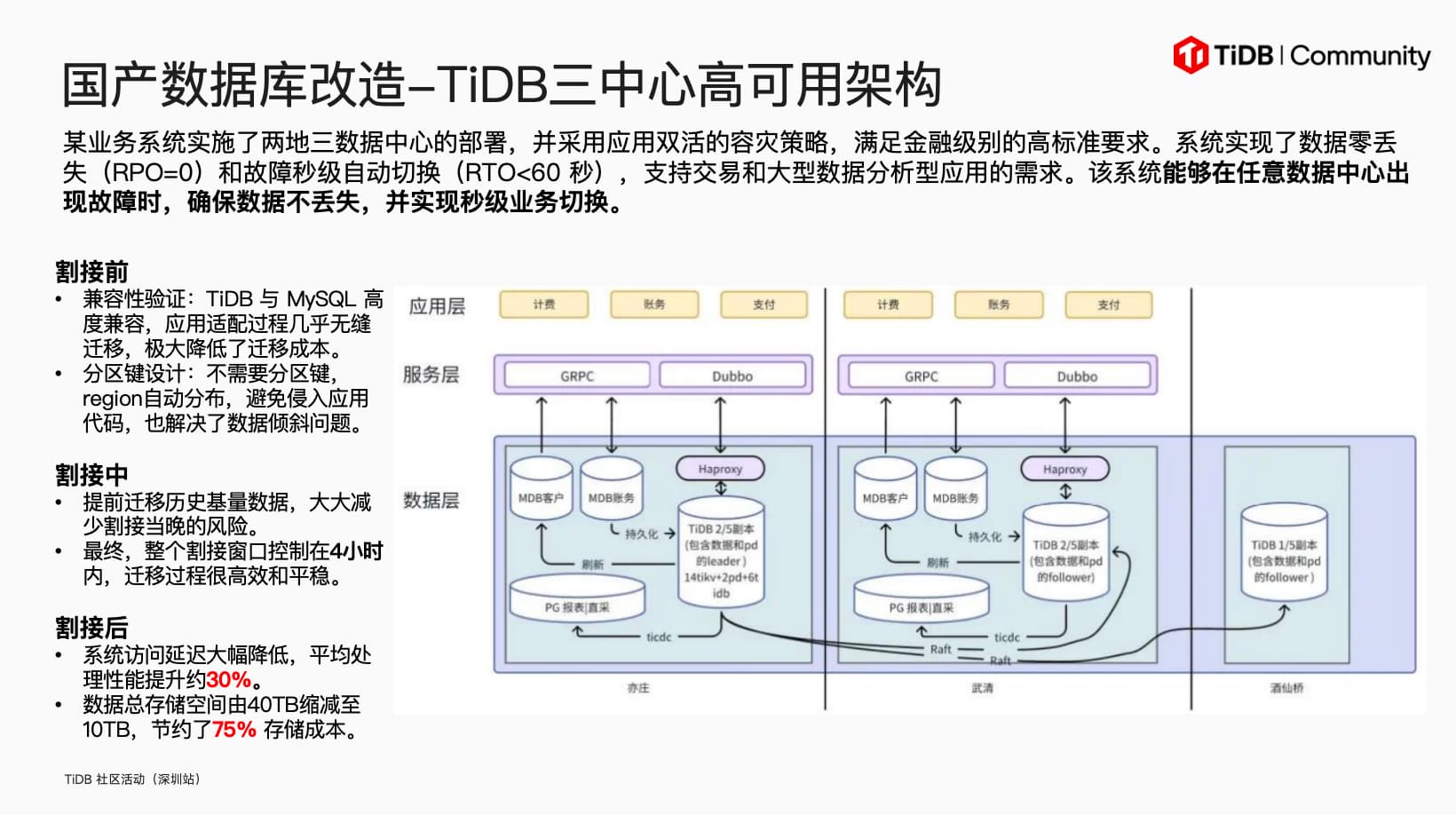话题概要:李文杰老师分享了TiDB在国产化替换中的实践与思考。针对金融级高可用需求,通过两地三中心部署实现RPO=0、RTO<60秒,结合HTAP架构支持混合负载。迁移中采用在线平滑替换策略:从CentOS到CTyunOS时,通过节点滚动升级确保业务无感知;X86转ARM架构时,利用TiDB跨平台能力分步扩容缩容,优化NUMA绑核降低30%性能损耗。改造后存储成本降低75%(40TB→10TB),处理性能提升30%。关键经验包括提前迁移历史数据、规避元数据锁问题,并通过社区工具保障数据一致性。全栈适配需关注软硬件协同优化,为信创转型提供可靠方案。