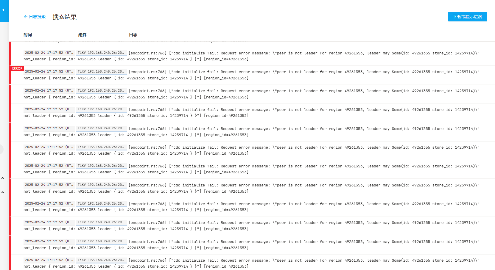 这种错误很常见,一般不是阻止tso推进的根因,可以看下cdc leader 的日志有没有相关报错信息,之前遇到过cdc延迟一直上涨,tso不推荐,是因为有dml语句,表没有索引导致下游执行时间超过2min。看监控图,现在是恢复了吗?可以 pause,resume 下看看