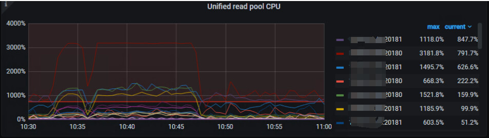 unifired read pool CPU视图中,store_id 是410 的cpu在慢SQL期间值很高。