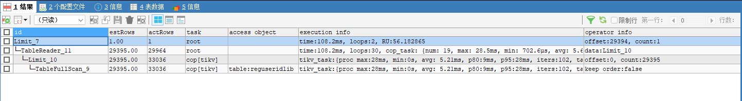 从另一个角度,可以看到带where条件的时候cop_task是23个,不带where的时候cop_task只有19个。也是少了20%的。但还是慢了。