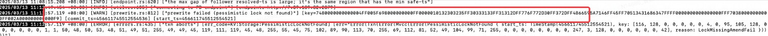 ticLockNotFound { start_ts: TimeStamp(456533202726813701), key: [116, 128, 0, 0, 0, 0, 0, 4, 0, 95, 105, 128, 0, 0, 0, 0, 0, 0, 1, 1, 50, 48, 50, 53, 48, 51, 48, 57, 255, 50, 51, 45, 119, 111, 119, 45, 48, 255, 55, 45, 51, 48, 82, 87, 71, 120, 255, 51, 81, 51, 52, 75, 84, 67, 99, 255, 0, 0, 0, 0, 0, 0, 0, 0, 247, 3, 128, 0, 0, 0, 0, 0, 0, 42], reason: LockTsMismatch })))))\ngithub.com/tikv/client-go/v2/error.ExtractKeyErr\n\t/root/go/pkg/mod/github.com/tikv/client-go/v2@v2.0.8-0.20240417121055-7b4535c36317/error/error.go:310\ngithub.com/tikv/client-go/v2/txnkv/txnlock.ExtractLockFromKeyErr\n\t/root/go/pkg/mod/github.com/tikv/client-go/v2@v2.0.8-0.20240417121055-7b4535c36317/txnkv/txnlock/lock.go:27\ngithub.com/tikv/client-go/v2/txnkv/transaction.actionPrewrite.handleSingleBatch\n\t/root/go/pkg/mod/github.com/tikv/client-go/v2@v2.0.8-0.20240417121055-7b4535c36317/txnkv/transaction/prewrite.go:440\ngithub.com/tikv/client-go/v2/txnkv/transaction.(*batchExecutor).startWorker.func1\n\t/root/go/pkg/mod/github.com/tikv/client-go/v2@v2.0.8-0.20240417121055-7b4535c36317/txnkv/transaction/2pc.go:1980\nruntime.goexit\n\t/usr/local/go/src/runtime/asm_amd64.s:1598\ngithub.com/pingcap/errors.AddStack\n\t/root/go/pkg/mod/github.com/pingcap/errors@v0.11.5-0.20231212100244-799fae176cfb/errors.go:174\ngithub.com/pingcap/errors.Trace\n\t/root/go/pkg/mod/github.com/pingcap/errors@v0.11.5-0.20231212100244-799fae176cfb/juju_adaptor.go:15\ngithub.com/pingcap/tidb/store/driver/error.ToTiDBErr\n\t/workspace/source/tidb/store/driver/error/error.go:187\ngithub.com/pingcap/tidb/store/driver/txn.extractKeyErr\n\t/workspace/source/tidb/store/driver/txn/error.go:162\ngithub.com/pingcap/tidb/store/driver/txn.(*tikvTxn).extractKeyErr\n\t/workspace/source/tidb/store/driver/txn/txn_driver.go:316\ngithub.com/pingcap/tidb/store/driver/txn.(*tikvTxn).Commit\n\t/workspace/source/tidb/store/driver/txn/txn_driver.go:100\ngithub.com/pingcap/tidb/session.(*LazyTxn).Commit\n\t/workspace/source/tidb/session/txn.go:429\ngithub.com/pingcap/tidb/session.(*session).commitTxnWithTemporaryData\n\t/workspace/source/tidb/session/session.go:809\ngithub.com/pingcap/tidb/session.(*session).doCommit\n\t/workspace/source/tidb/session/session.go:690\ngithub.com/pingcap/tidb/session.(*session).doCommitWithRetry\n\t/workspace/source/tidb/session/session.go:943\ngithub.com/pingcap/tidb/session.(*session).CommitTxn\n\t/workspace/source/tidb/session/session.go:1070\ngithub.com/pingcap/tidb/session.autoCommitAfterStmt\n\t/workspace/source/tidb/session/tidb.go:297\ngithub.com/pingcap/tidb/session.finishStmt\n\t/workspace/source/tidb/session/tidb.go:259\ngithub.com/pingcap/tidb/session.runStmt\n\t/workspace/source/tidb/session/session.go:2441\ngithub.com/pingcap/tidb/session.(*session).ExecuteStmt\n\t/workspace/source/tidb/session/session.go:2271\ngithub.com/pingcap/tidb/server.(*TiDBContext).ExecuteStmt\n\t/workspace/source/tidb/server/driver_tidb.go:294\ngithub.com/pingcap/tidb/server.(*clientConn).handleStmt\n\t/workspace/source/tidb/server/conn.go:2133\ngithub.com/pingcap/tidb/server.(*clientConn).handleQuery\n\t/workspace/source/tidb/server/conn.go:1901\ngithub.com/pingcap/tidb/server.(*clientConn).dispatch\n\t/workspace/source/tidb/server/conn.go:1388\ngithub.com/pingcap/tidb/server.(*clientConn).Run\n\t/workspace/source/tidb/server/conn.go:1169\ngithub.com/pingcap/tidb/server.(*Server).onConn\n\t/workspace/source/tidb/server/server.go:718\nruntime.goexit\n\t/usr/local/go/src/runtime/asm_amd64.s:1598