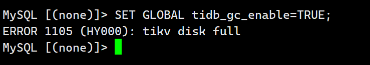 【问题复现路径】导数据前关闭了GC, 数据导入时磁盘满了。把表删除后,想把GC开启回收下数据,但提示ERROR 1105 (HY000): tikv disk full