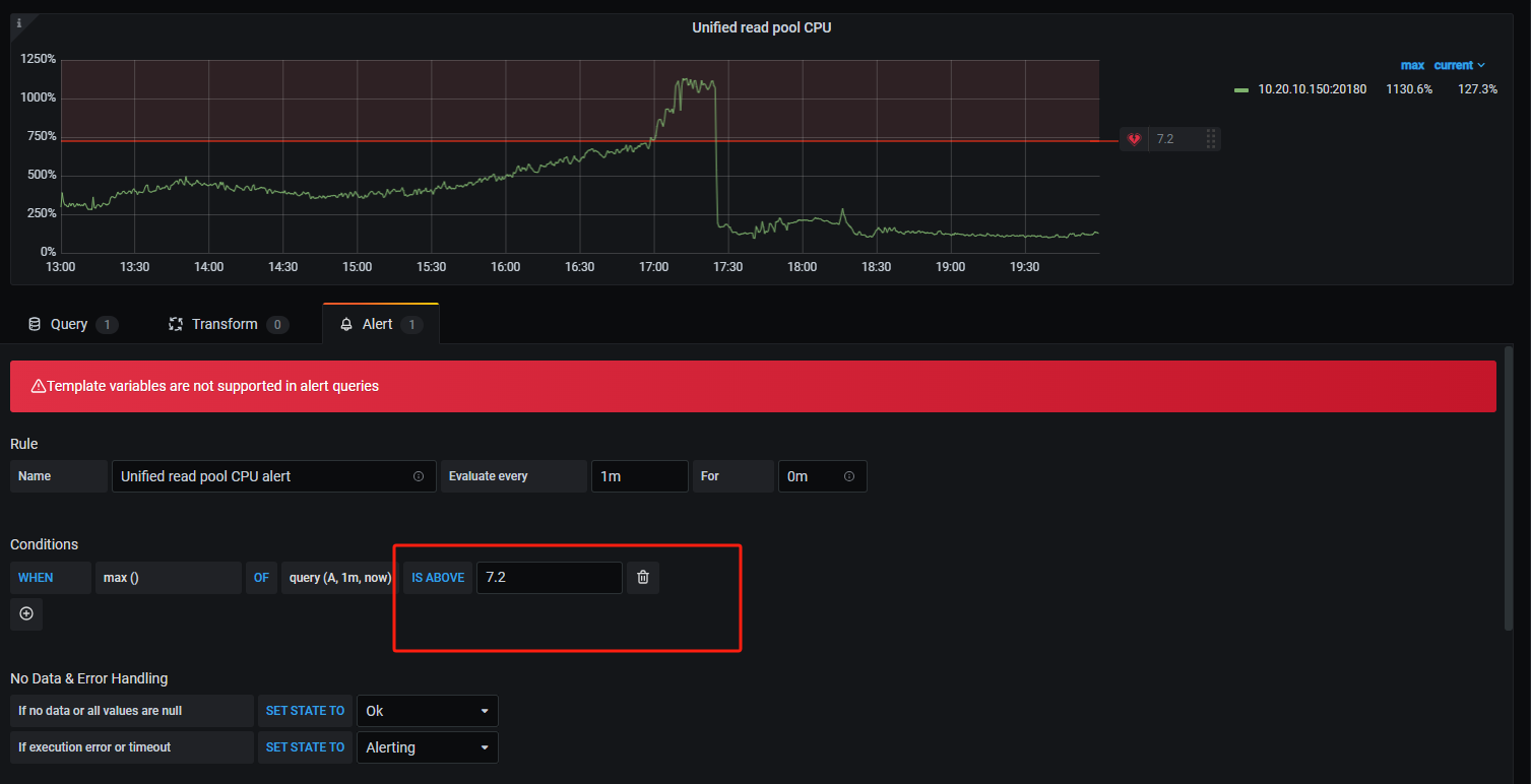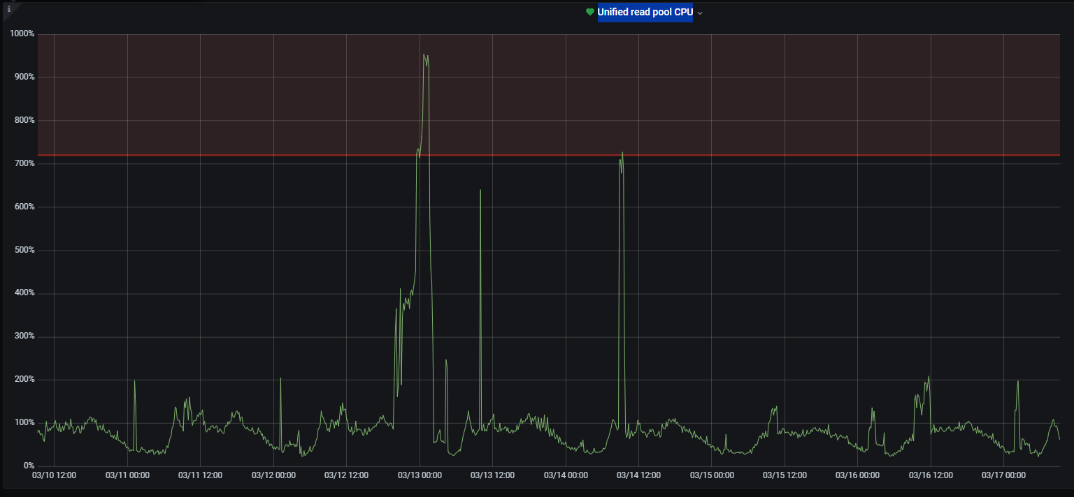 监控项Unified read pool CPU有明显的毛刺现象,导致数据库偶尔延迟变大,这个应该是磁盘读写吞吐变大导致的,这个监控中的红线是限制线程池的使用?我是16核cpu,为什么默认限制这么低?