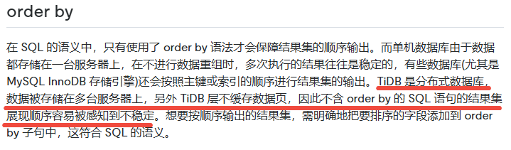 tidb返回数据不加order by是乱序的,包括使用union all也不保证顺序