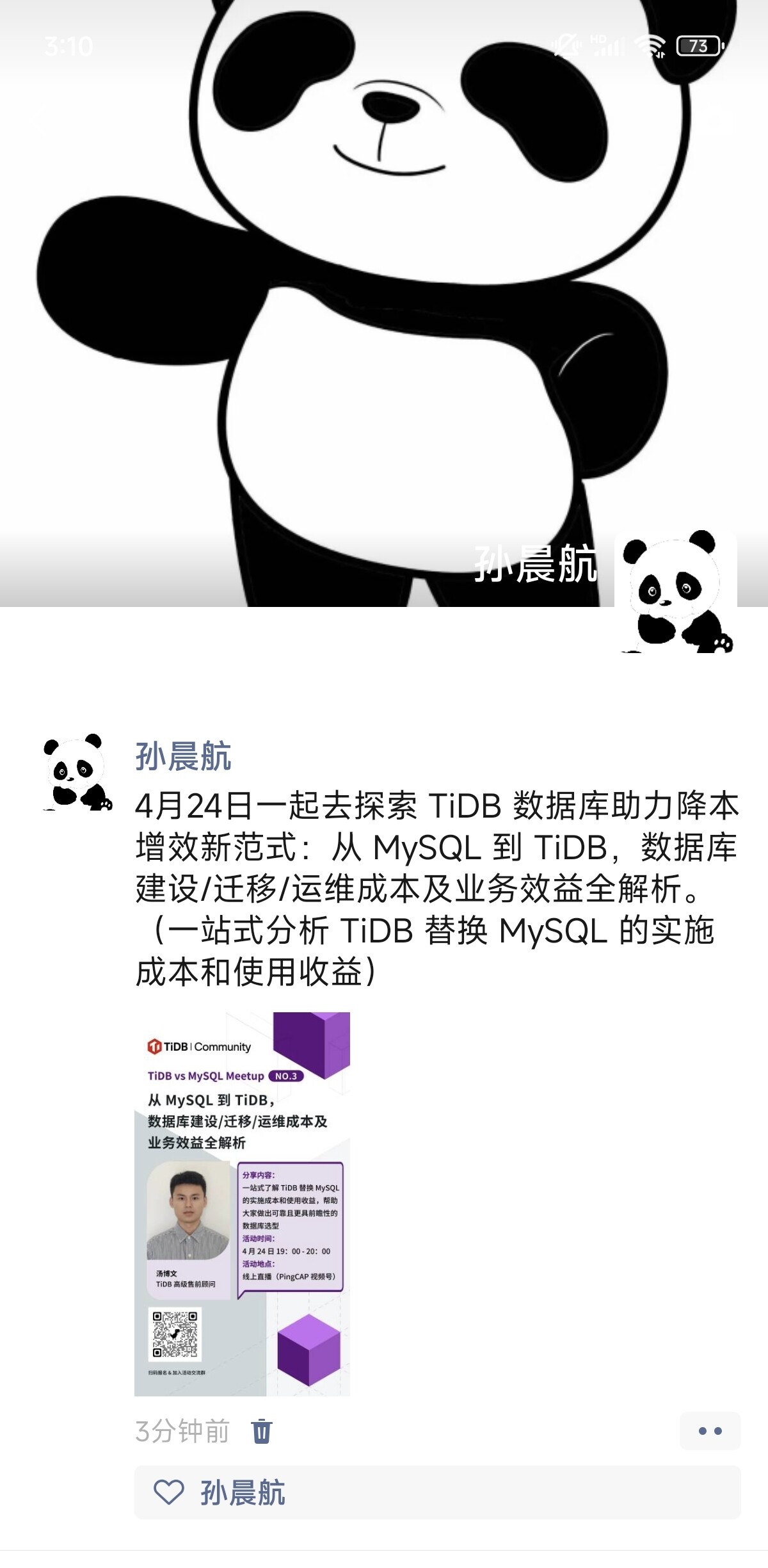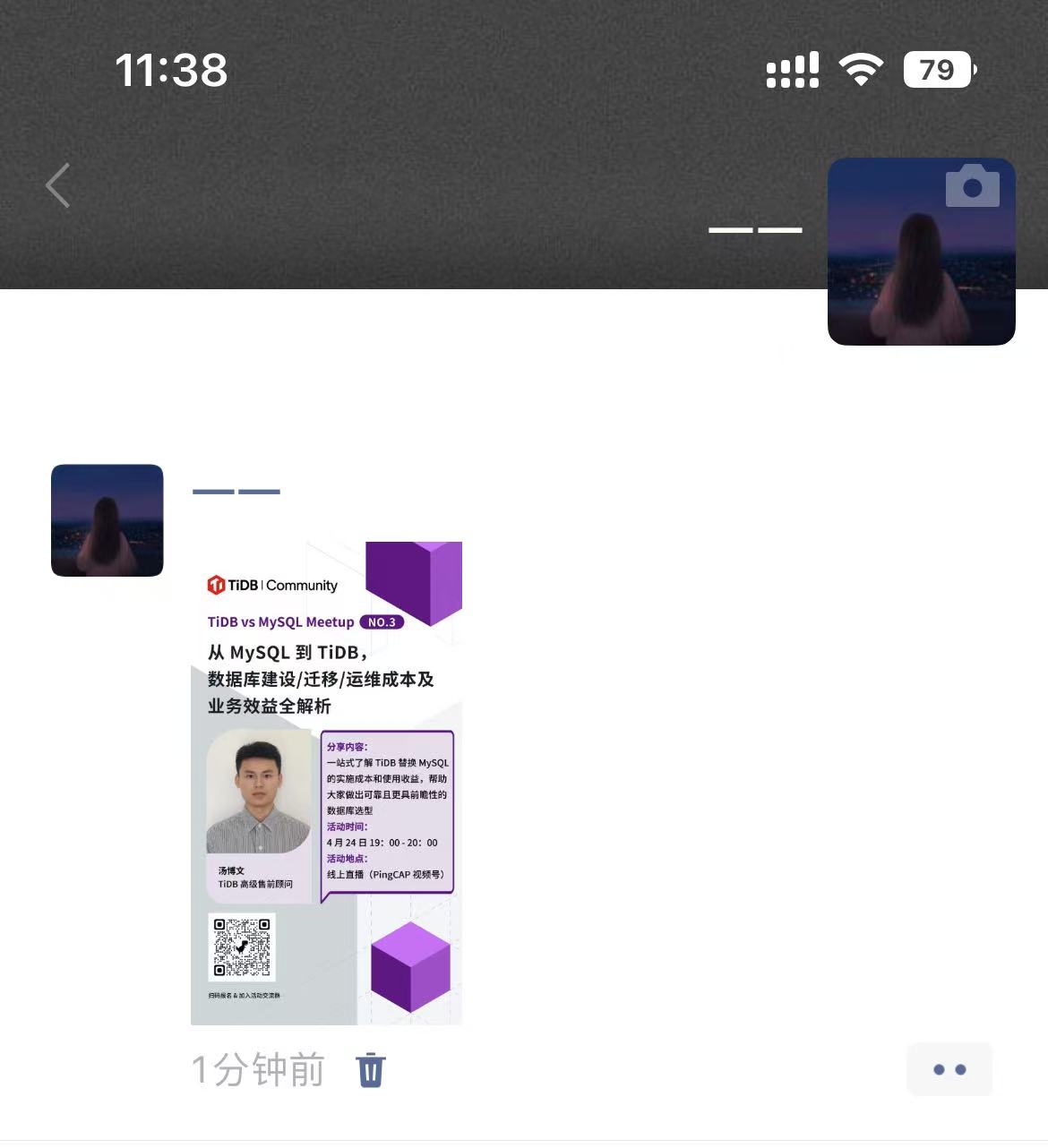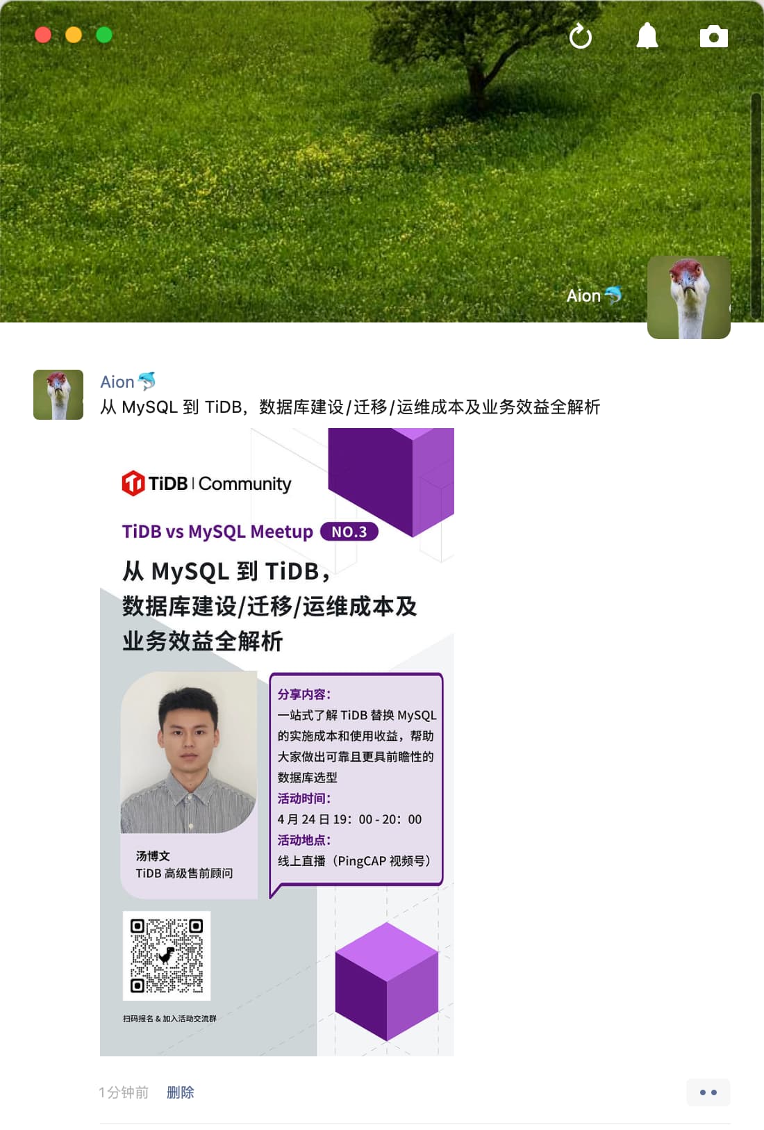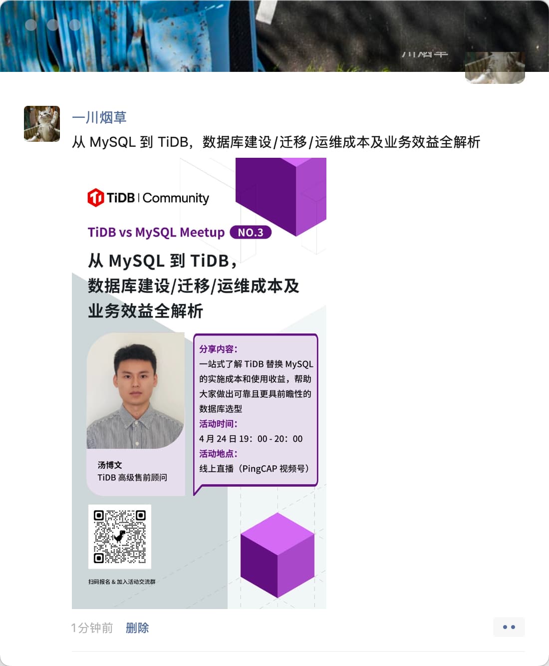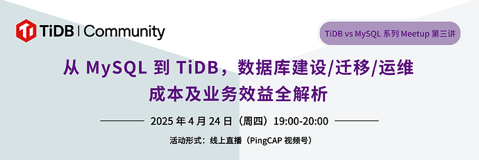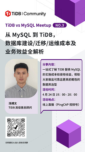 如果用 TiDB 来进行 MySQL 的替换,除了关注 TiDB 的使用收益外,数据库系统的建设、迁移、运维成本也是大家在数据库选型/替换阶段非常关注的。4 月 24 日晚上 19:00-20:00,TiDB vs MySQL Meetup 第三期将在 PingCAP 视频号开播,汤博文老师将和大家一起详细分析 TiDB 替换 MySQL 的成本收益,帮助大家做出可靠且更具前瞻性的数据库选型。