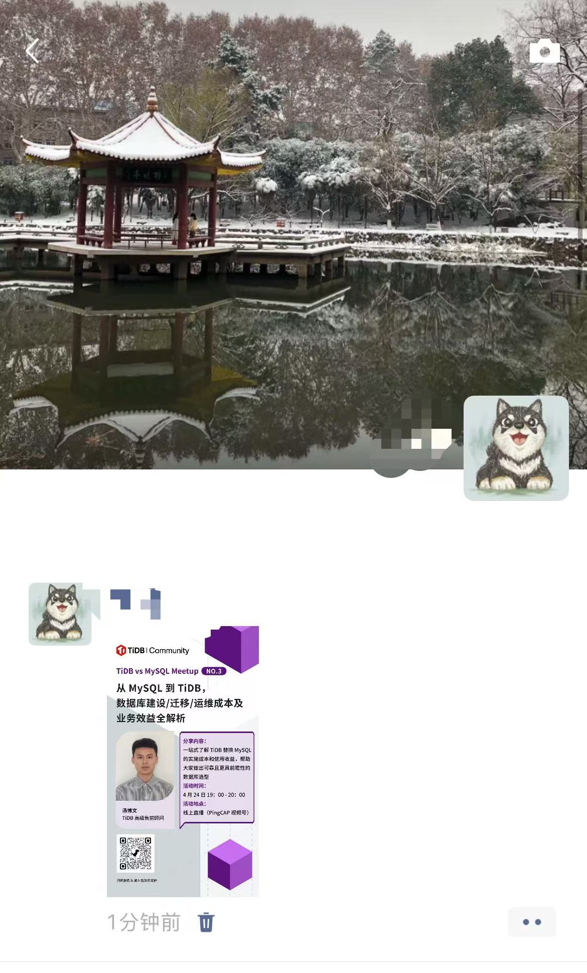 - 转发奖励:转发活动海报/推文至朋友圈,截图发送至评论区,即可获得 TiDB 社区活动宣传伙伴专属 80 积分 & 经验值(活动后发放),抽两位转发的小伙伴送 TiDB 2025 款双肩包!
