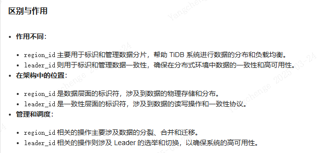 region id 是最小逻辑单位。然后逻辑单位由 3 个副本组成,3 个副本就是 peer id。leader id 就是 peer id 其中一个,也就是 3 副本里面有个 peer 是 leader。